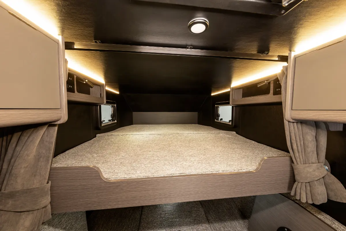 家のリビングのように足を伸ばしてくつろいだり、テーブルを囲んで食事を楽しんだり、夜はフルフラットベッドに展開してゆっくり眠ることもできます。
