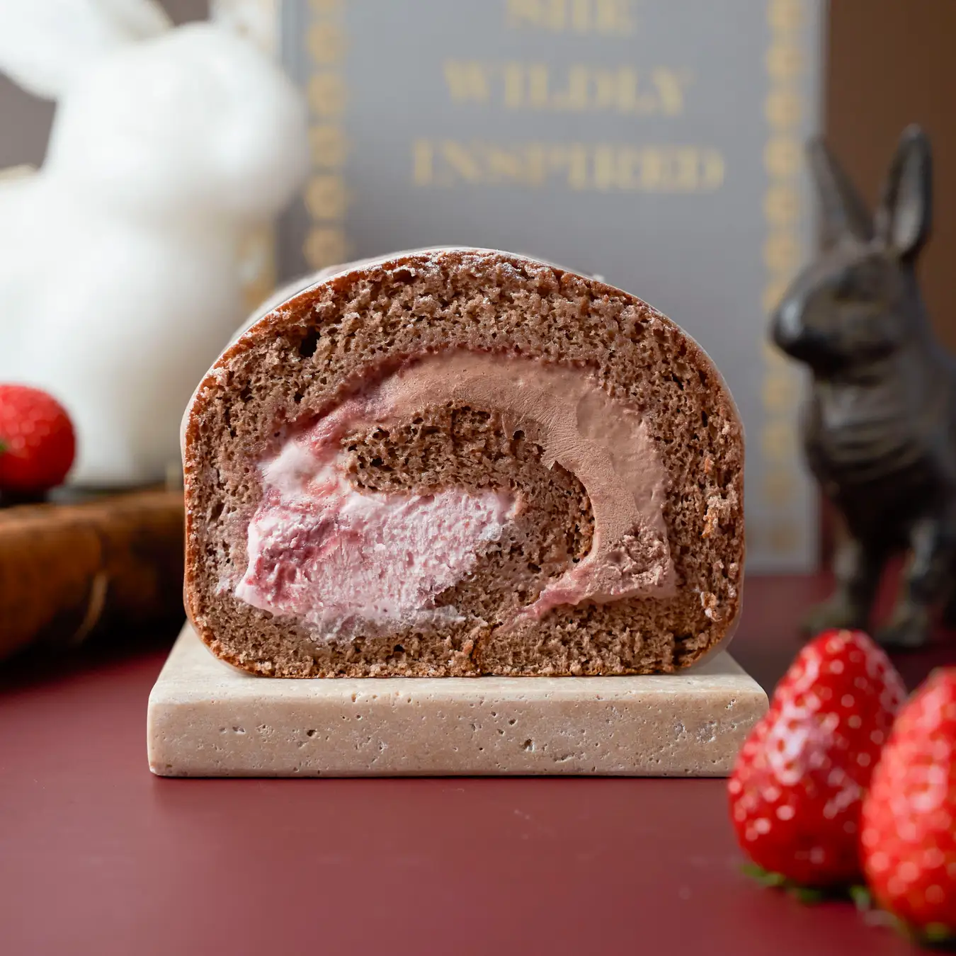 定番のロールケーキもバレンタインの装いで登場。苺を練り込んだ甘酸っぱいクリームとチョコレートクリームをふんわりとしたココア生地でくるりと巻き上げました。生地には自家製の苺ジャムを塗り、より一層苺の味わいを感じられます。濃厚ながら軽い口当たりで、最後の一口まで飽きのこないおいしさです。