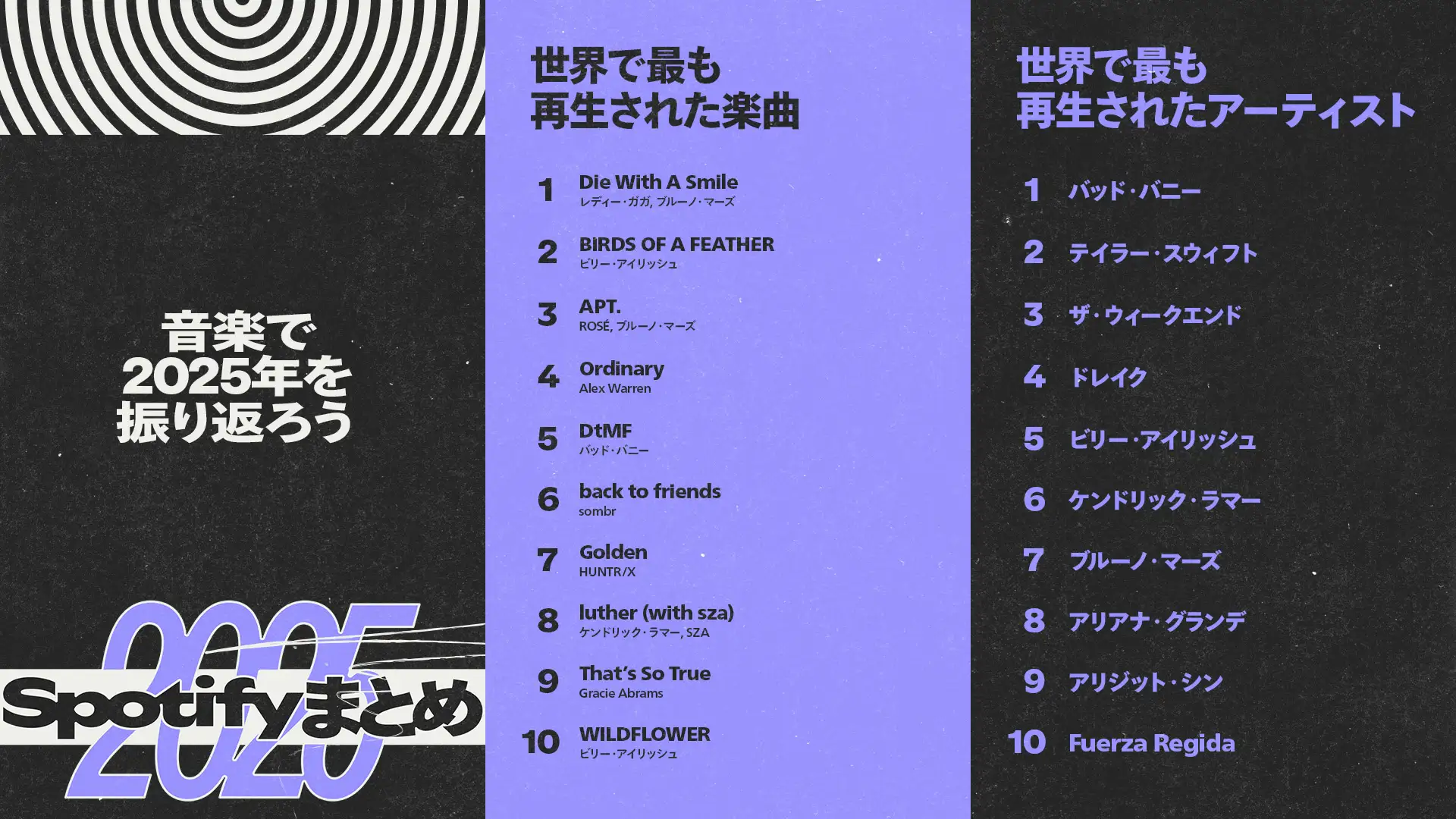世界で7億1300万人以上が利用するオーディオストリーミングサービス Spotify(会社名 Spotify AB / 本社 Stockholm、Sweden)は、音楽やポッドキャストなどの今年のリスニングデータから2025年を振り返る各種ランキングを発表しました。