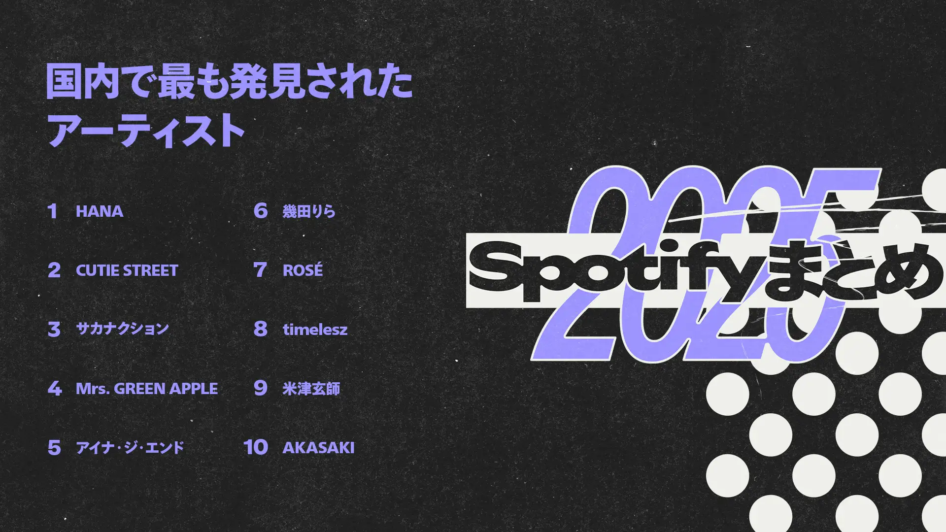 2025年、国内で最も発見されたアーティストはHANAでした。デビュー以来数々の楽曲をヒットチャートの上位に送り込んできたHANAは、強いメッセージ性と個性豊かなメンバーの魅力で2025年の音楽シーンを席巻し、多くの新規リスナーを獲得しました。