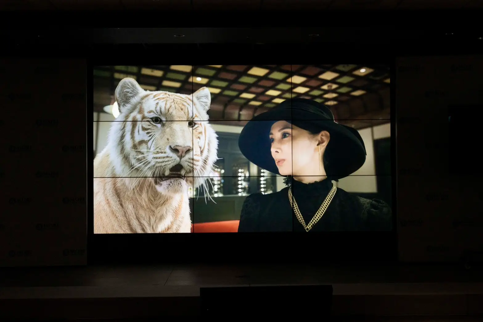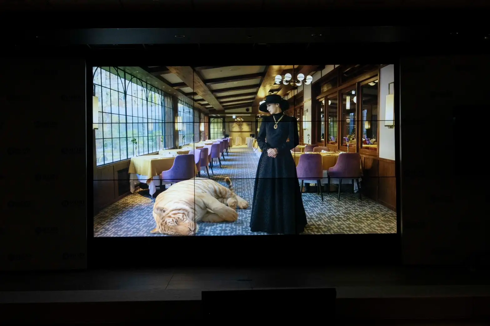 CMで着用した貴婦人衣装を身にまとった北川景子さん。その豪華な装いは、会場の視線を一身に集めました。CMをご覧になった感想について北川さんは、「当日は実際のトラがいないので、イメージしながら演じていたが、完成した映像に可愛らしいトラが入っていて、『こういう感じなんだ』と微笑ましくなった」と回答。さらに「現場でこっそり行列に混ざって、憧れのアップルパイとロイヤルミルクティーを頂くことができました。忘れられない贅沢な休憩時間だった」といった貴重な撮影秘話も披露されました。