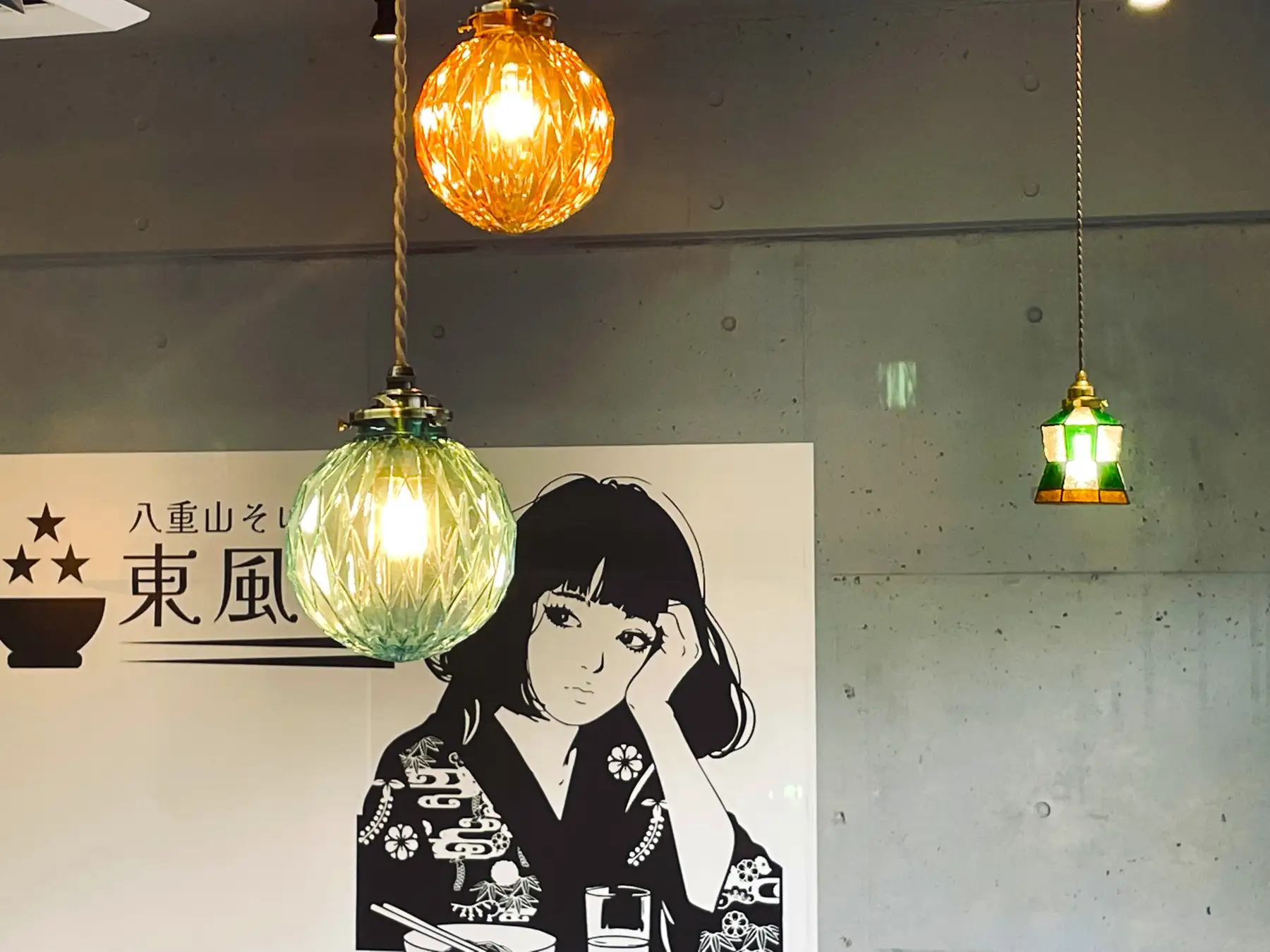 店内は、令和らしいシンプルさと(コンクリ打ちっぱなし)島の温もり(琉球ガラスペンダント、