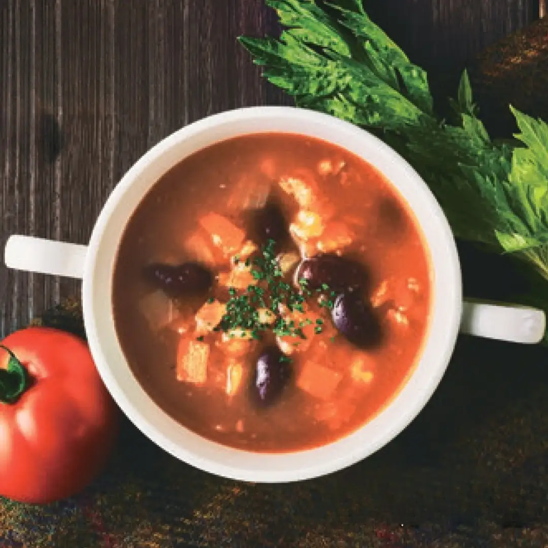 具材はトマト、玉ねぎ、キャベツ、ごぼう、ミズクワイ、にんじん、セロリ、にんにく、赤いんげん豆、押麦、ショルダーベーコンなどを使用してます。(Tokyo Food Bar 成田空港店、BECK’S STATION LOUNGE 東中野店、東京新幹線店、東京新幹線南店、丸の内南口店、大宮新幹線店、舞浜店、ラスカ熱海店、伊東店、高円寺、信濃町、西日暮里、新小岩駅前店では取り扱いがありません)