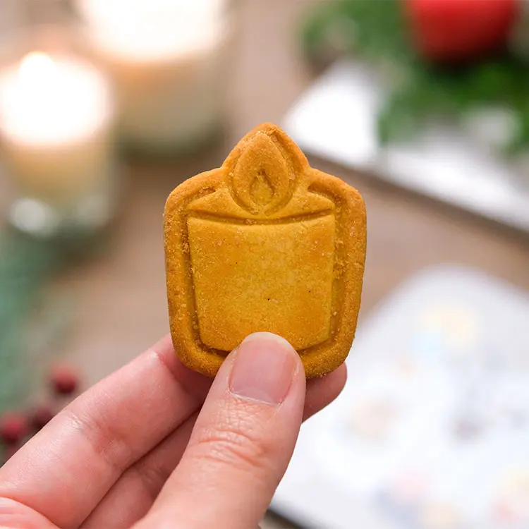 「ちょっと冷たい空気のなか、キャンドルをつけてティータイムを楽しむひとときをイメージしたデザインです。キャンドルの煌めきをイメージして、砂糖がキラキラしたクッキーや冬のモチーフのクッキーが勢揃い。かわいらしい缶に仕上がっています。今回の缶はすこしコンパクトになって新登場。ちょうどいいクッキーの量でおいしく食べ切ることができます。」