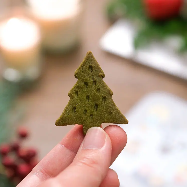 宇治抹茶の香りがすっと広がる、サクッと軽やかな抹茶サブレです。きび砂糖のまろやかな甘さが抹茶の風味をそっと引き立て、もみの木の形と相まって、冬の森を思わせるやさしい一枚に仕上がっています。ひとつひとつ丁寧に手作りした特別な存在です。