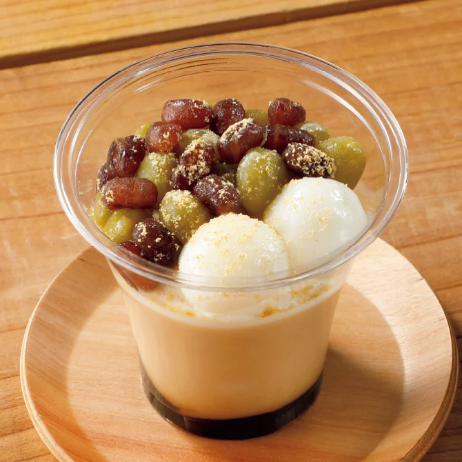 黒蜜ソースともっちり食感のきなこプリンの上に、ホイップクリーム、お団子、うぐいす豆とかのこ小豆を盛り付けました。上品な甘さとコク深い余韻を楽しめる和スイーツです。
