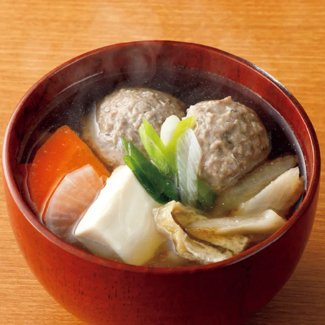 いわしのつみれ、豆腐、大根、人参、ごぼう、長ねぎ、油揚げの七品目の具材を使用したつみれ汁です。野菜の旨みとかつおと昆布、いわしの出汁を感じられる一杯です。