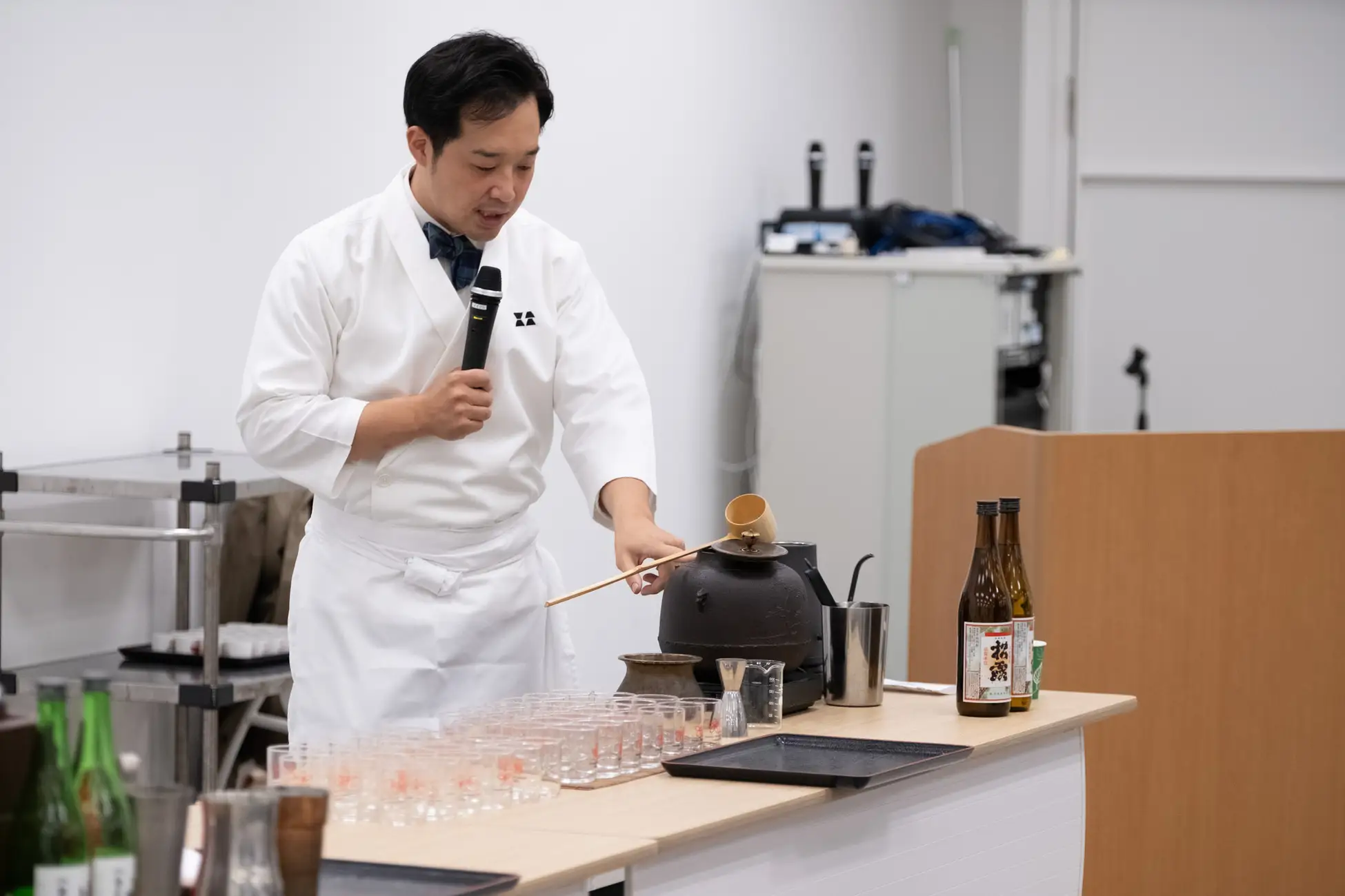 髙崎氏は、燗酒とは 「単にお酒を温める行為ではなく、味を設計する行為」 という考え方を示しました。 特に「ぬる燗」と言われる低めの温度帯では、日本酒が本来持つ酸・旨味・香りのバランスが表れやすいと説明。 参加者は、わずかな温度差によって味わい全体の印象が大きく変化することを体感しました。