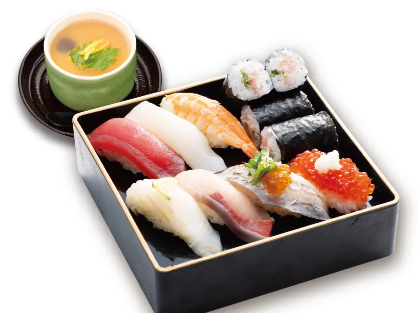 まぐろ・いか・蒸しえび・ネギとろ巻き・ひらめ塩〆・ぶり・太刀魚炙り・すじこ・茶碗蒸し