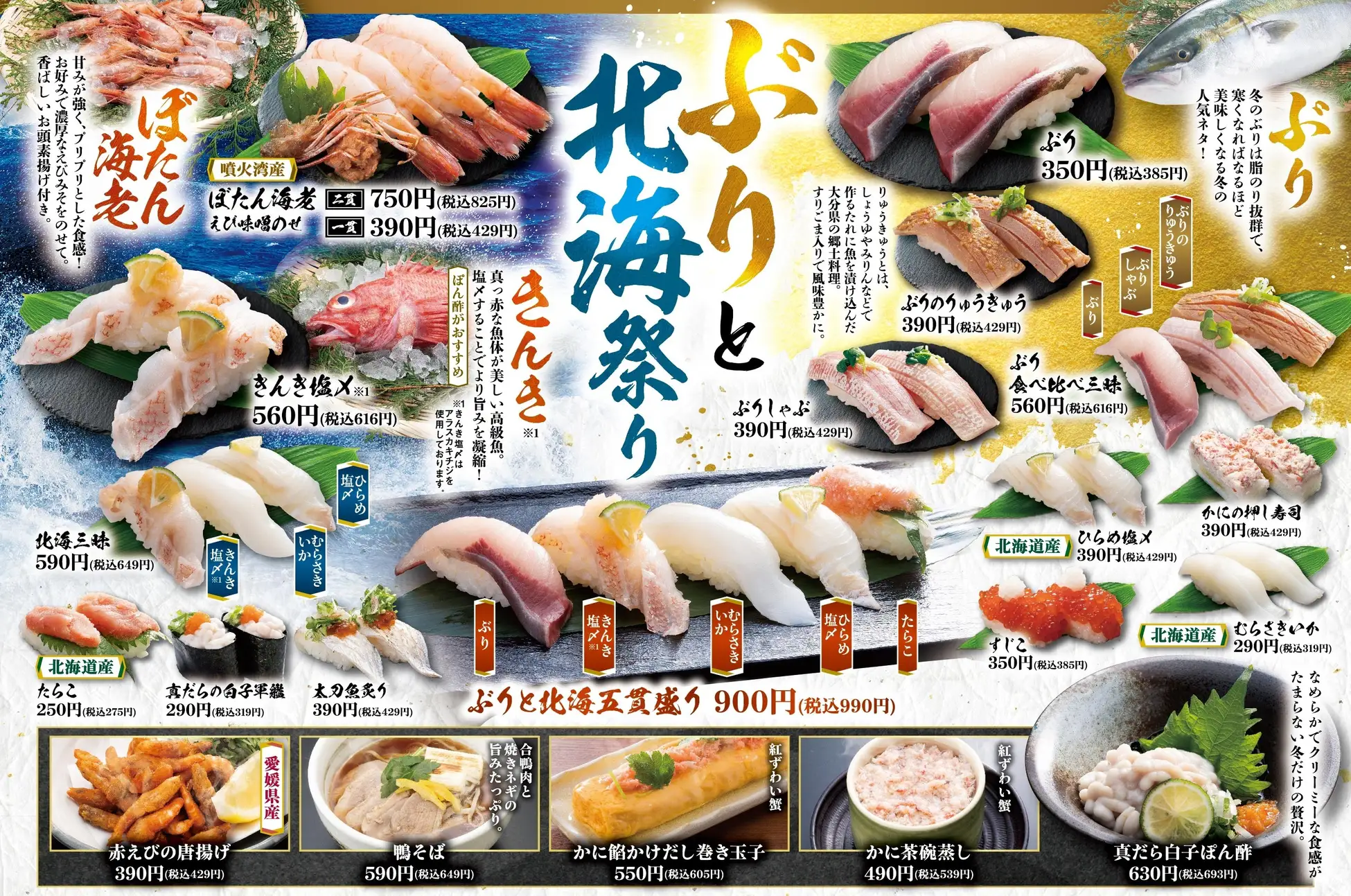 本フェアでは冬のおすすめメニュー第二弾として寿司とサイドメニュー合わせて全20品が登場!第一弾に続き、冬のダントツ人気の「ぶり」をはじめ、北海の幸が勢揃い!「ぼたん海老えび味噌のせ」は噴火湾産のプリプリ食感で濃厚なえび味噌とお頭の素揚げ付きで海老を丸ごと楽しめる一皿です。