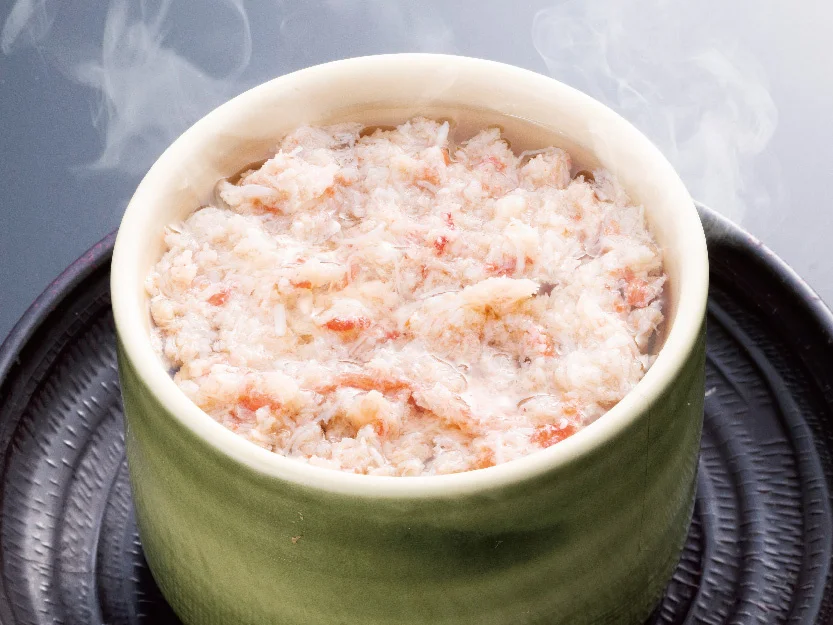 紅ずわい蟹を贅沢に使った冬限定の茶碗蒸し。銀杏、鶏肉、しいたけなど具沢山、出汁がきいた熱々のあんかけ仕立てです。
