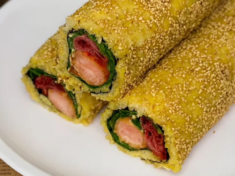 プリプリの海老カツと、ジューシーで柔らかなローストビーフに特製カレーソースを合わせ、香り高いジャスミンライスで巻き上げました。具材たっぷりで、スパイス香る贅沢な恵方巻きです。