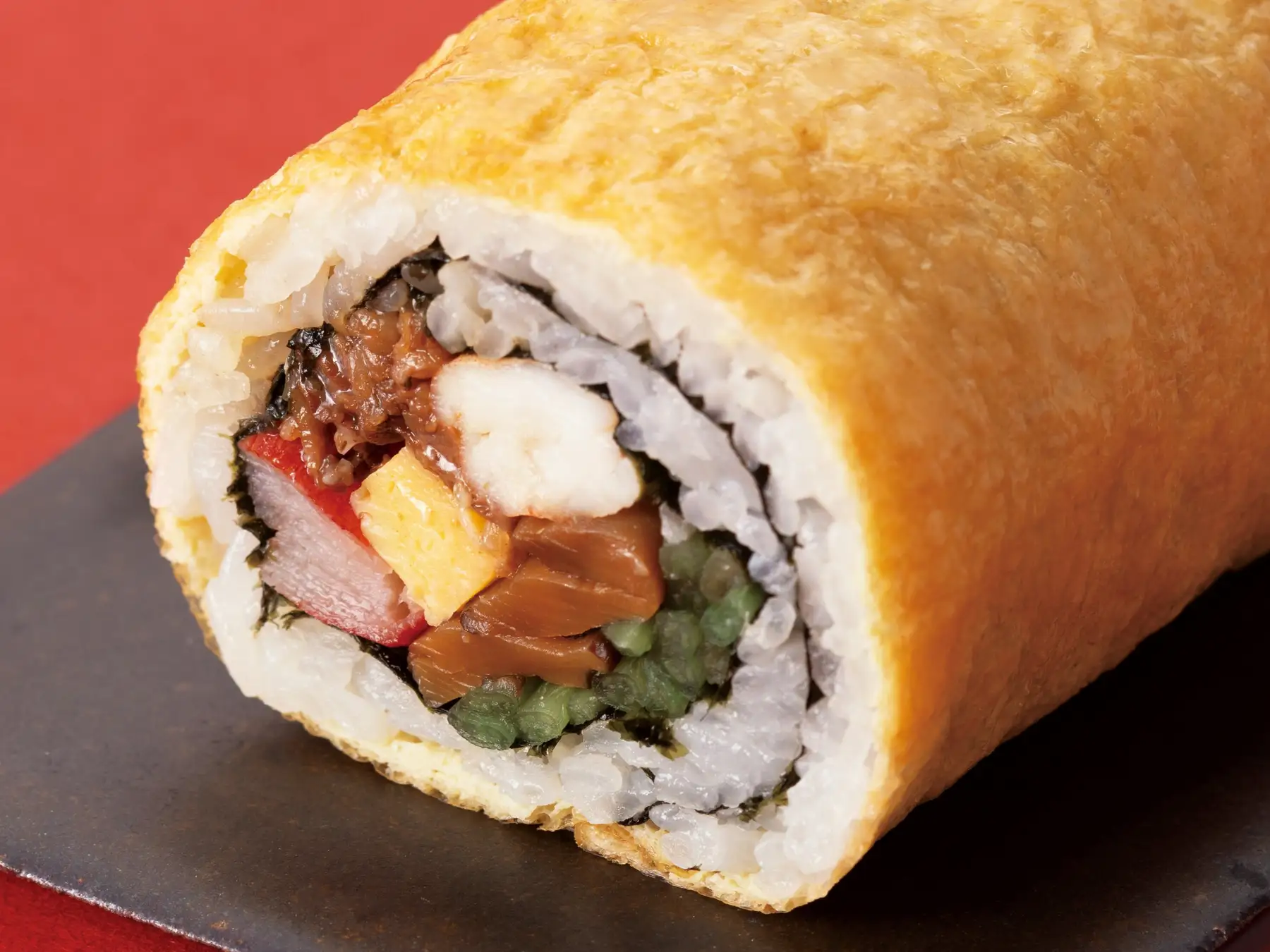 ローストビーフに、ほろ苦い菜の花、上品な甘さのカステラ玉子焼きなどの具材を、「お揚げ」で巻きました。かんぴょうやきゅうりの食感も楽しい、お肉も野菜もバランスよく味わえる満足度の高い一本です。