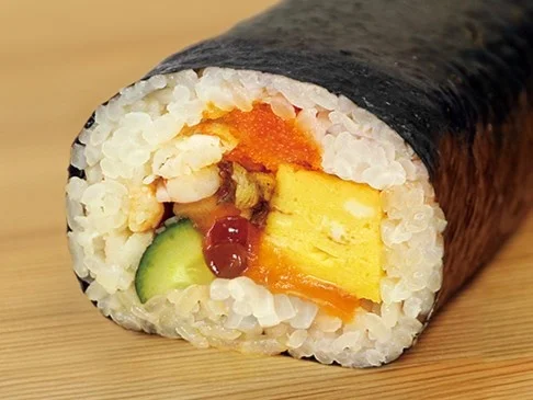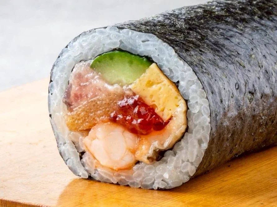 生本まぐろ、生アトランティックサーモン、真鯛、えび、いか、いくら、かに、玉子焼きなどが入った豪華なオリジナルの海鮮恵方巻です。海鮮の旨味がぎっしり詰まった、特別な味わいをぜひご賞味ください。