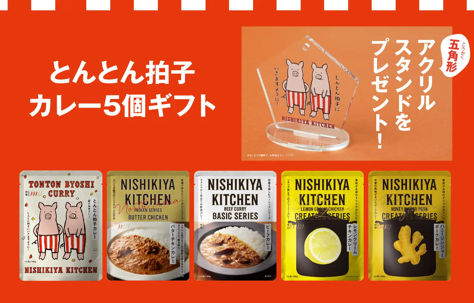 「とんとん拍子カレー5個ギフト」(税込2,580円)をお買い上げのお客様に、“合格”にちなんだ縁起の良い五角形の「オリジナルアクリルスタンド(非売品)」を数量限定でプレゼント。