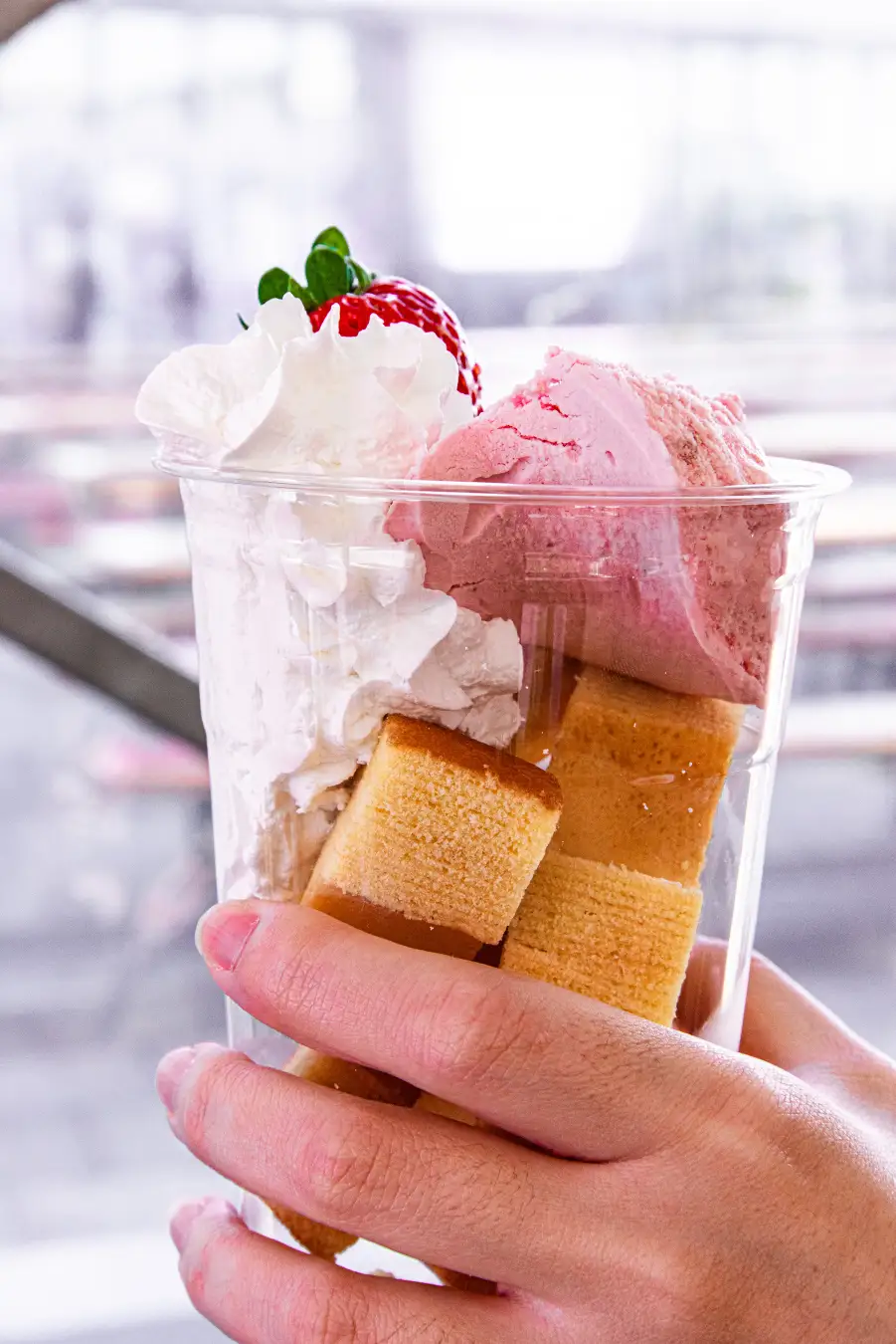 ひと口ごとに、いちごの甘酸っぱい果汁と、バターの風味豊かなバウムクーヘンのやさしい甘さが、口いっぱいに広がります。