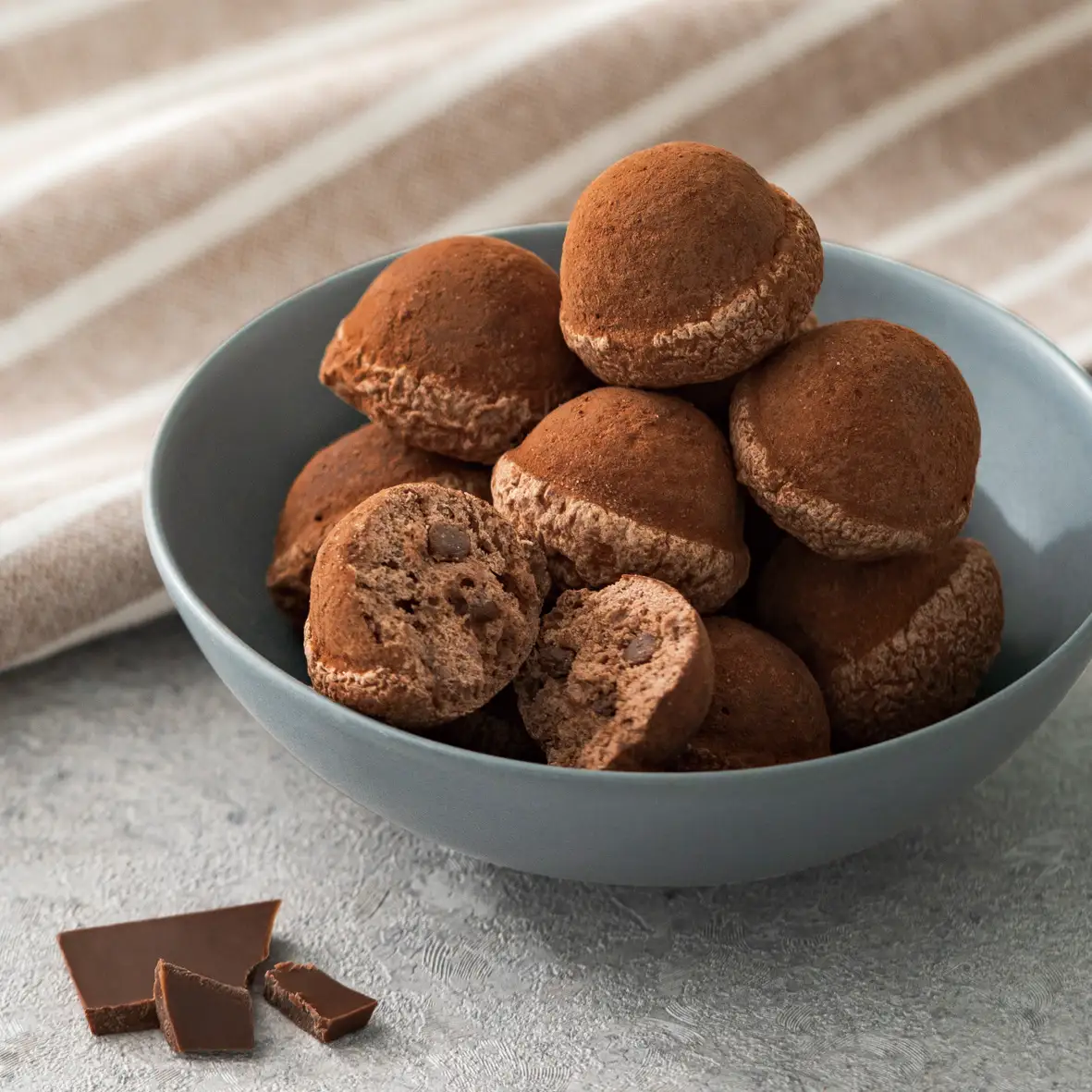 素朴なおいしさの鈴カステラをちょっと贅沢にアレンジ。 ふんわり軽い生地にチョコチップを混ぜ込み、ひとくちごとに楽しい食感のアクセントを加えました。 仕上げに振りかけたココアパウダーの香りとコクがふんわり広がります。
