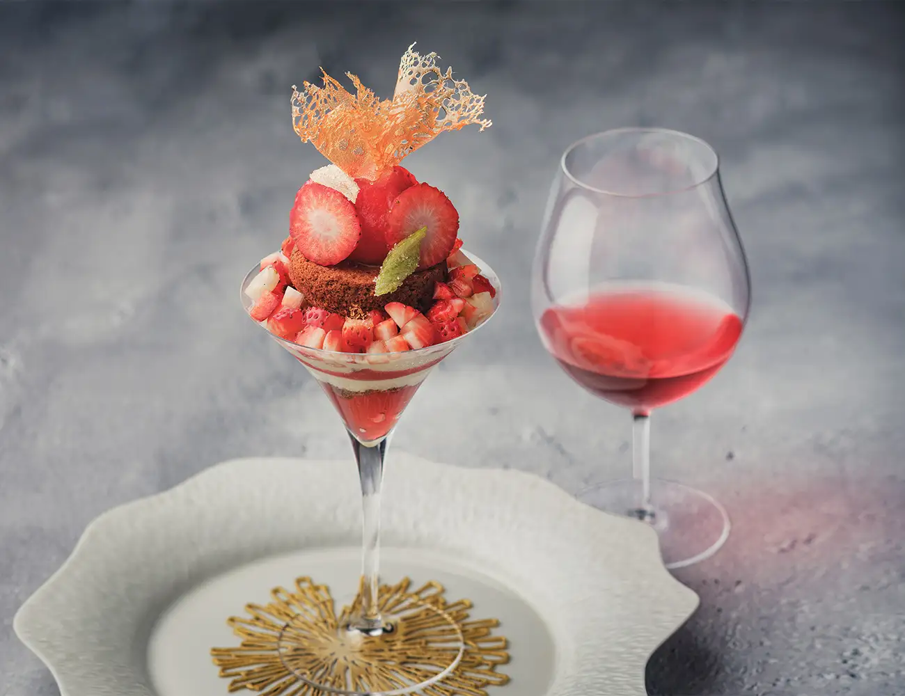 千葉県石井農園の苺と、旬の蕗の薹をミルクソルベに、タンザニアのフルーティなチョコレートを冷たいスフレとクリームにして合わせたパフェと共に、温かいモワルーショコラ、辺塚八朔とオペラのタルト、生チョコのプティフールもご提供。ペアリングドリンクとして、ハイビスカスやローズヒップなどを合わせたスパークリングハーブティーをご用意しております。※アルコールドリンクとしてシャンパーニュもご用意しております。