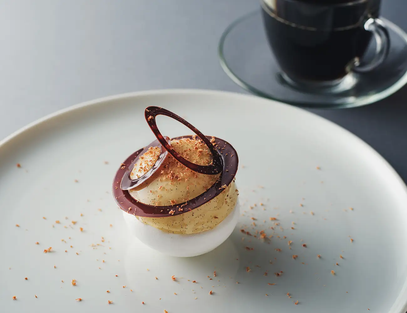 軽い燻製と香ばしい風味がありながら、上質なバニラ本来の豊かな味わいのある特別なバニラ「タドカ」を使用した一皿。なめらかで濃厚なキャラメルクリームを土台のメレンゲの中に忍ばせ、バニラライスプディングとタドカのガナッシュモンテを組み合わせました。※アイスのアメリカーノとカフェラテ(ホット・アイス)もご用意。
