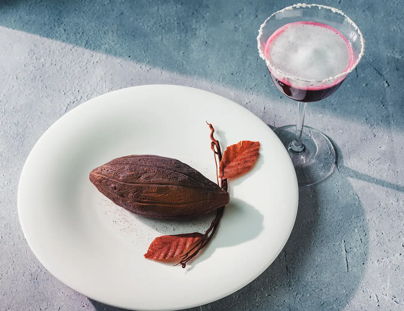 ピューレを使用した特製のカカオドリンクとともに提供いたします。※アルコールドリンクとしてシャンパーニュもご用意。