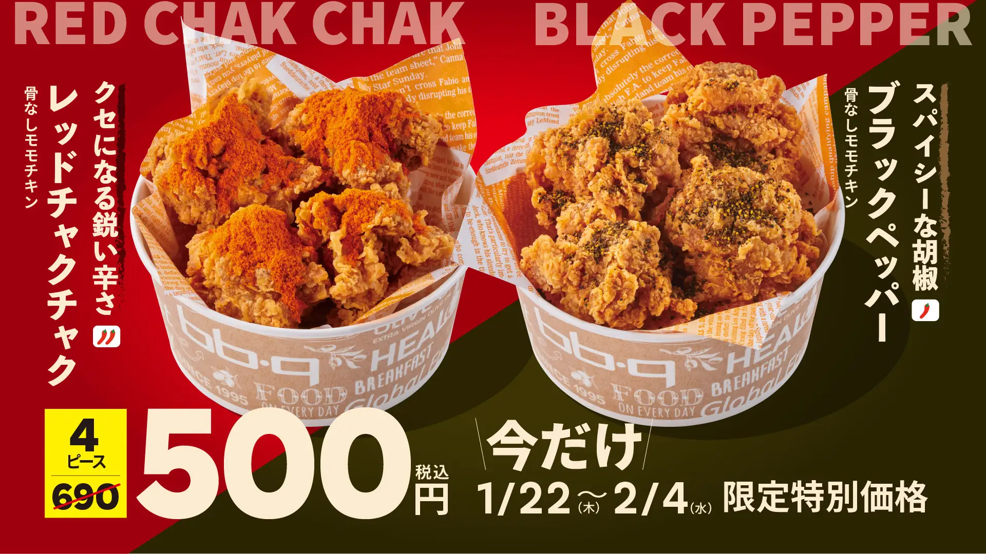 bb.q オリーブチキンカフェでは、定番フレーバーとして親しまれている「レッドチャクチャク」と「ブラックペッパー」を、期間限定の特別価格でご提供します。いずれも、bb.q自慢のサクサクとした衣とジューシーな鶏モモ肉が特徴の骨なしモモチキンに、それぞれ異なる刺激を加えた人気の味わいです。