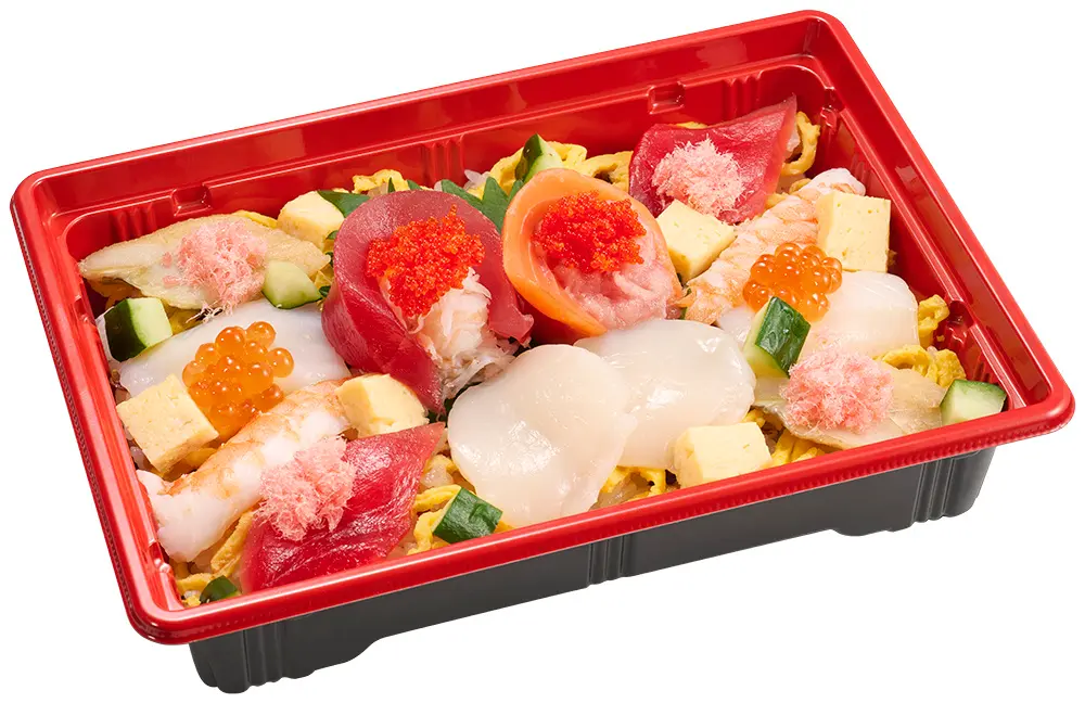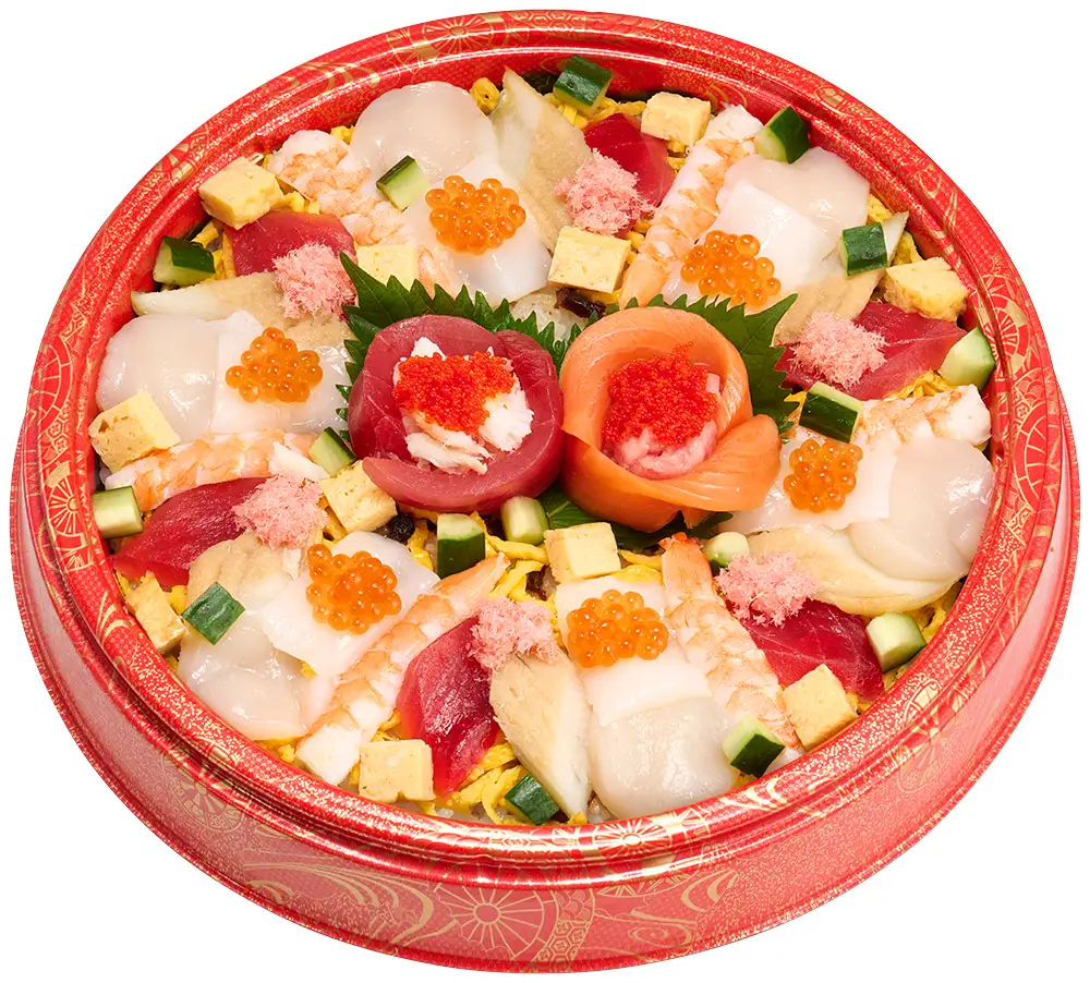 まぐろ・サーモン・いか・ほたて貝柱・煮あなご・えび・たまご・ねぎまぐろ・いくら・数の子バラコ・ずわいがに・きゅうり・大葉・中具(しいたけ・かんぴょうの甘煮)・錦糸玉子・桜でんぶ