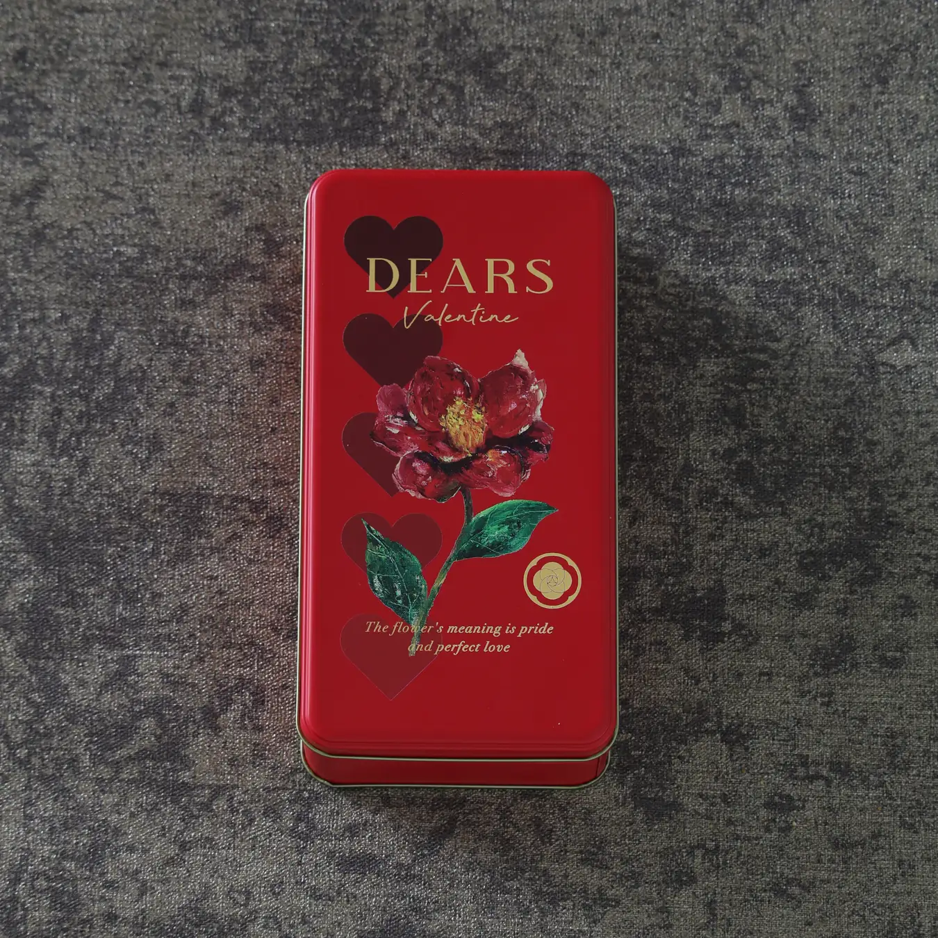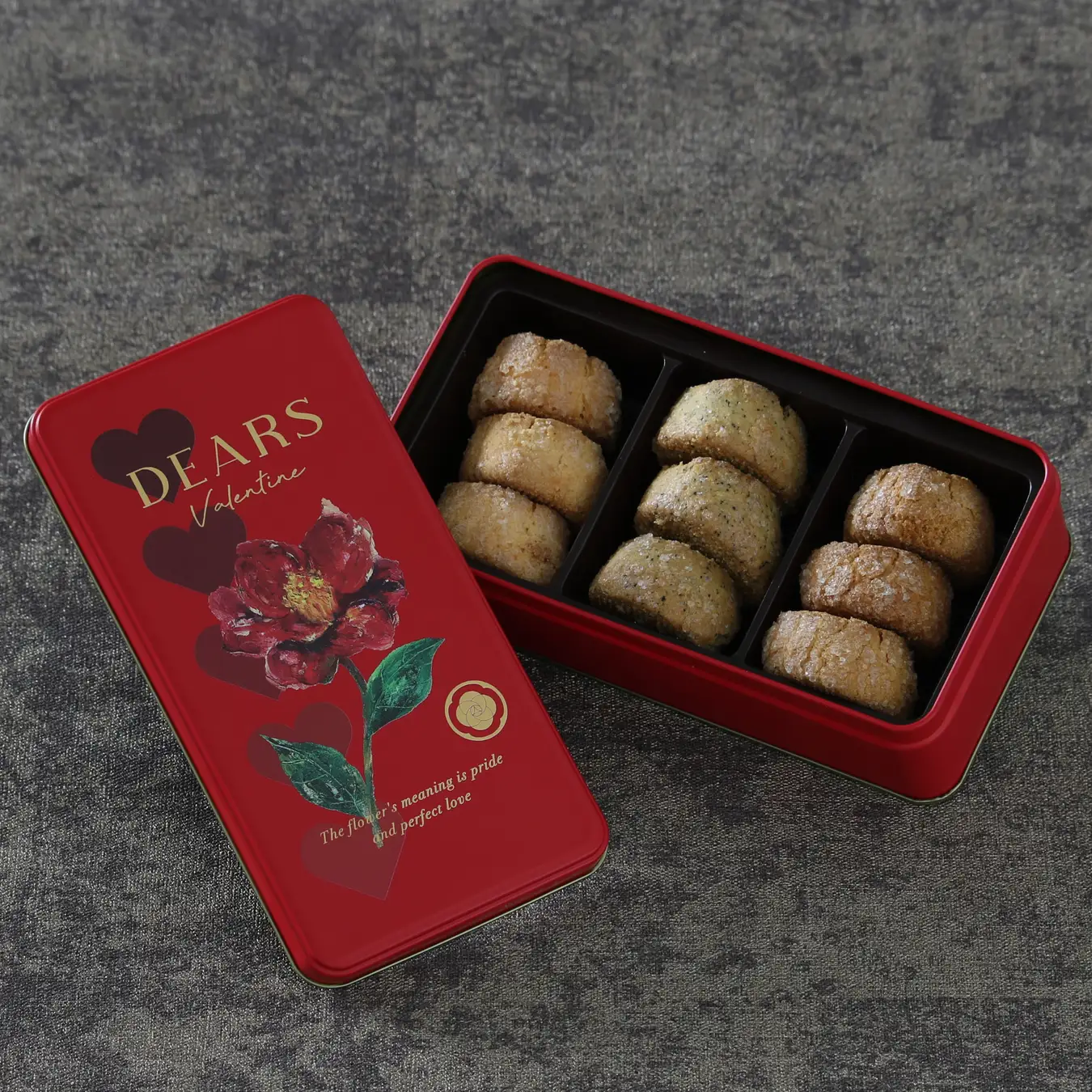 深紅の缶にツバキの花をあしらった、ロマンティックなバレンタイン限定パッケージ。