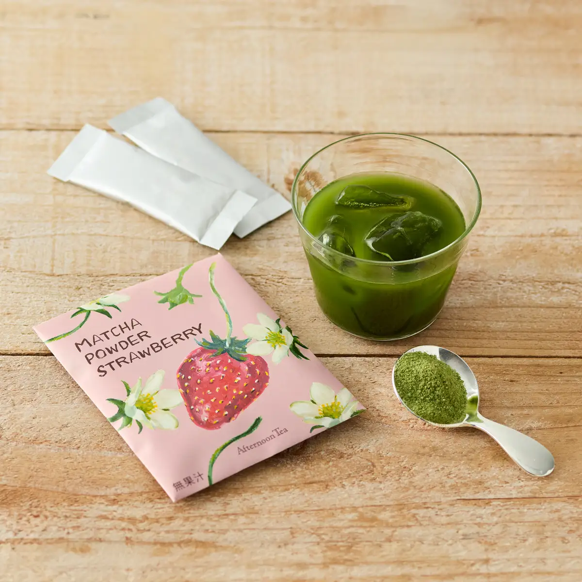 抹茶、苺パウダー、砂糖のみでシンプルに仕上げました。水やお湯を注ぐだけで素材本来の風味と、抹茶とフルーツの組み合わせをお楽しみいただけます。