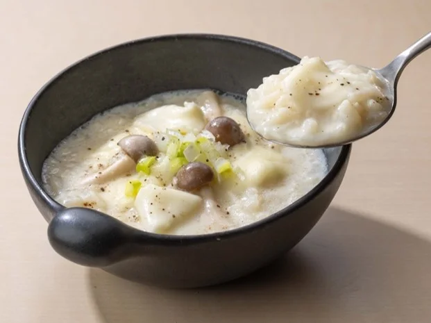 冬にぴったりなほどよい塩味が効いた、あさりが香るクラムチャウダーをイメージしたおだしです。 濃厚な旨味をお楽しみいただけます。