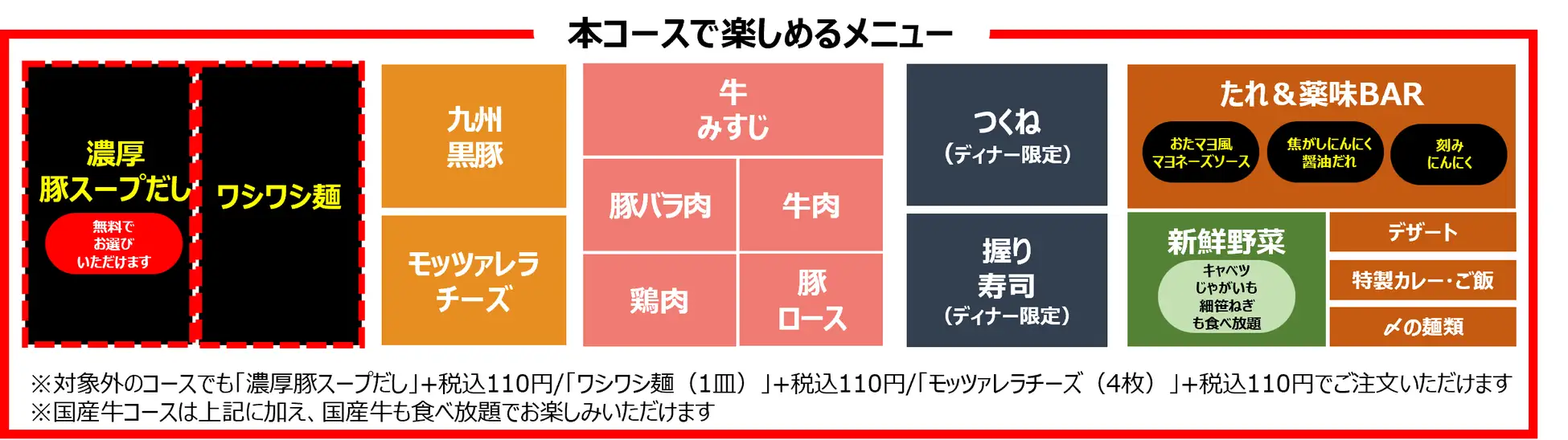 昨今の経済状況による原材料価格をはじめとした各種コストの高騰を受け、以下食べ放題コースにおける価格を、2026年1月22日(木)より、全コース(※を除く)一律+100円(税込110円)の改定をいたします。引き続き企業努力を重ね、安全・安心で楽しめる食事体験をお客さまに提供してまいります。