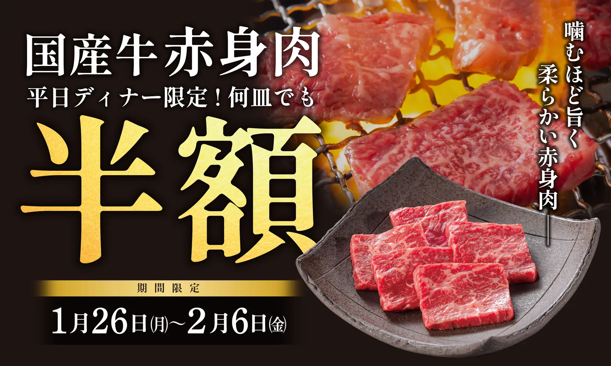 本キャンペーンでは、注文皿数に制限はなく「何皿食べても半額」で提供。平日の夜限定の特別企画として、お仕事帰りやご家族・ご友人とのお集まりに最適です。ヘルシー志向の方にも支持される、今注目の赤身肉を存分にご堪能いただけるこの機会をお見逃しなく。