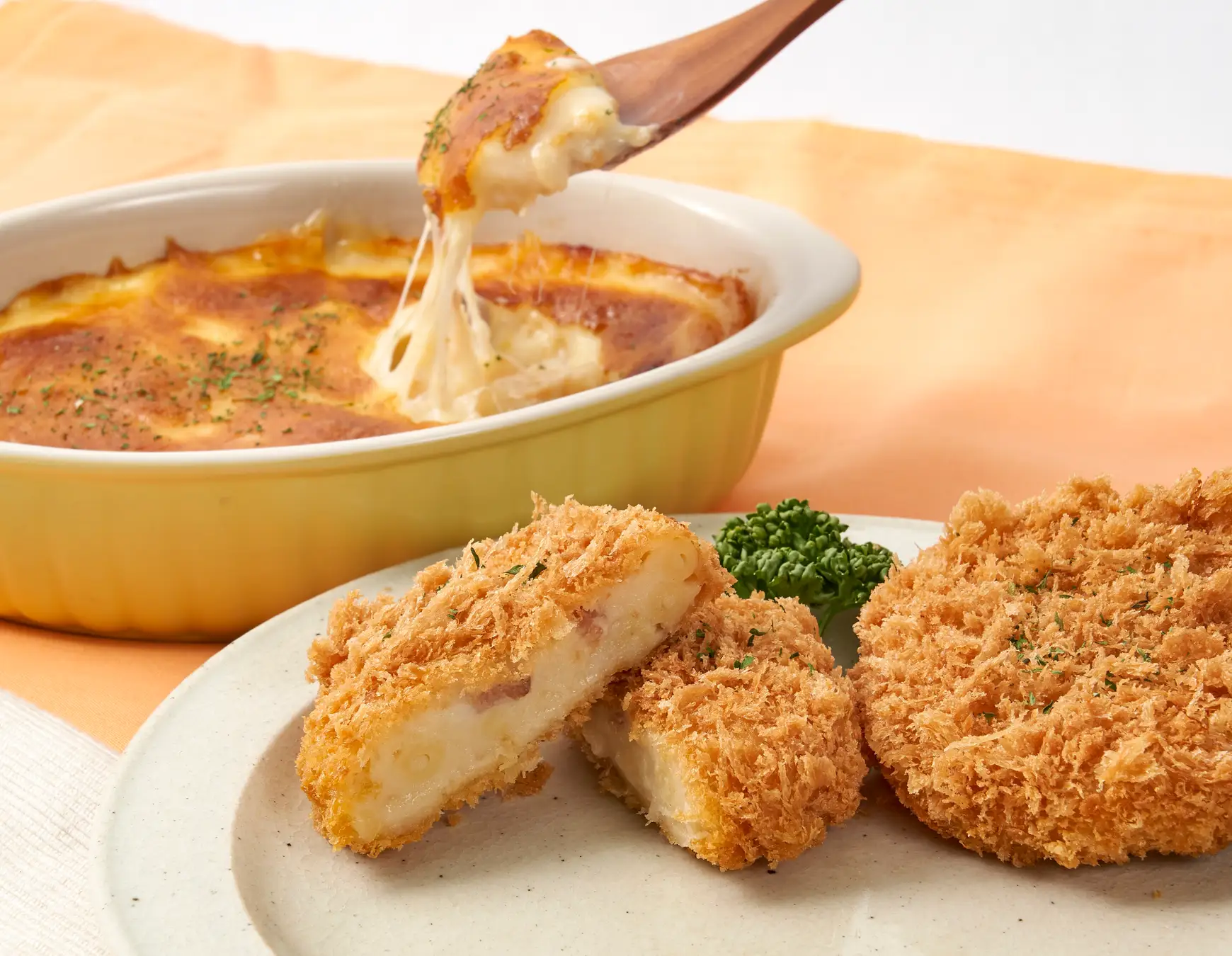コクのあるチェダーチーズと、まろやかなゴーダチーズを合わせた濃厚なベシャメルソースでマカロニとベーコンを和え、まい泉オリジナルのパン粉をまとわせたクリームコロッケです。洋食屋さんのチーズたっぷりなグラタンをイメージした、寒い冬にぴったりの季節限定商品です。そのままでも美味しいですが、温めるとチーズの風味が一層引き立ちます。