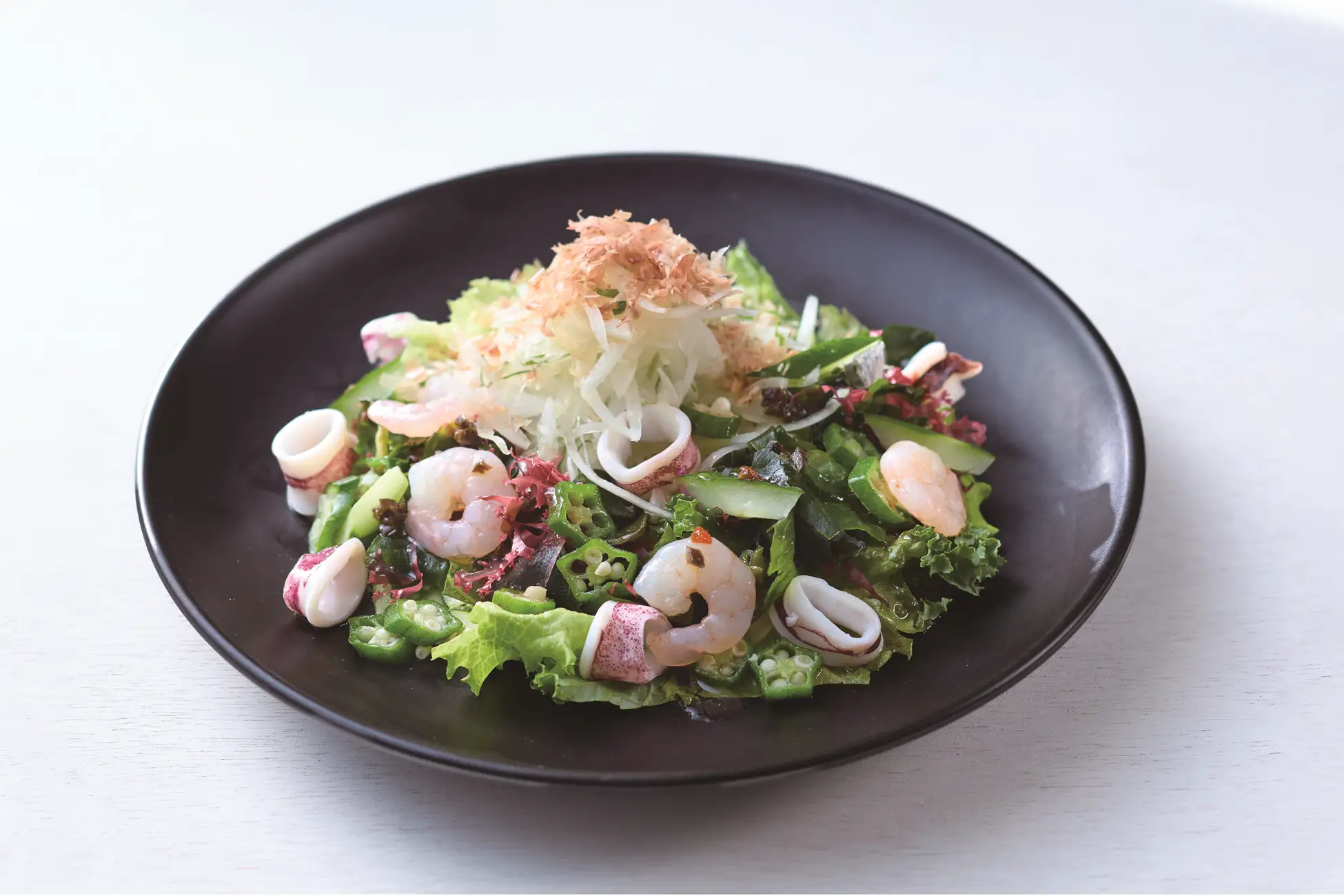 海老とイカに海藻と野菜の食感が楽しい一皿。かつお節の香りが広がる、さっぱりとしたサラダです。