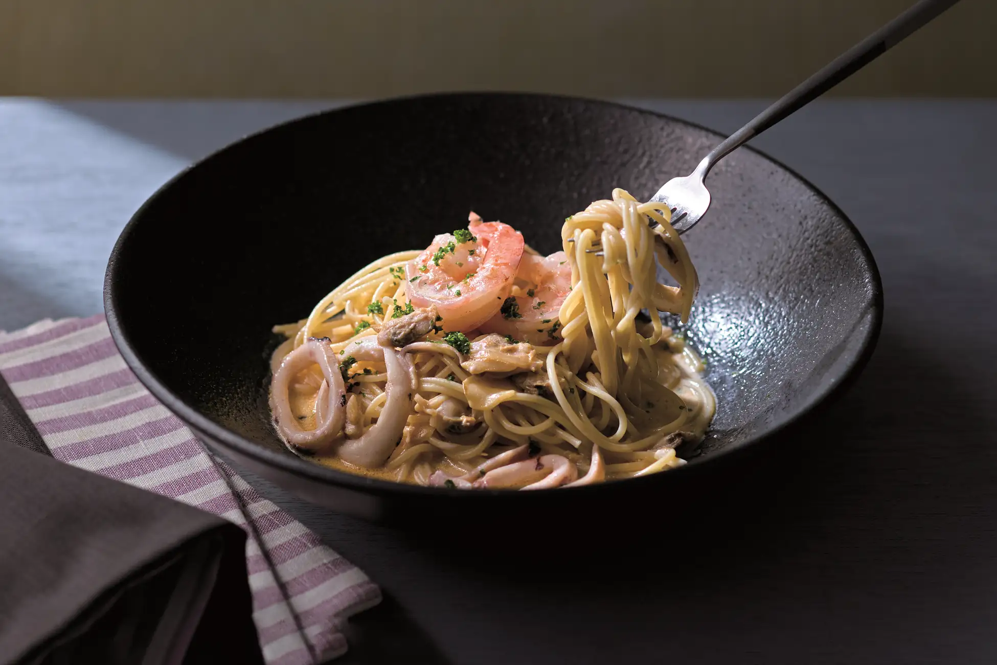ピエトロには、1990年代に登場した「海藻サラダ」、「海の幸」パスタという、多くの方に親しまれていたメニューがありました。その味をルーツに生まれたのが、今回、新登場した『海の幸のガーリッククリームソース』と『シーフードと海藻の和風サラダ』。懐かしさと新しさを併せ持つ一皿です。