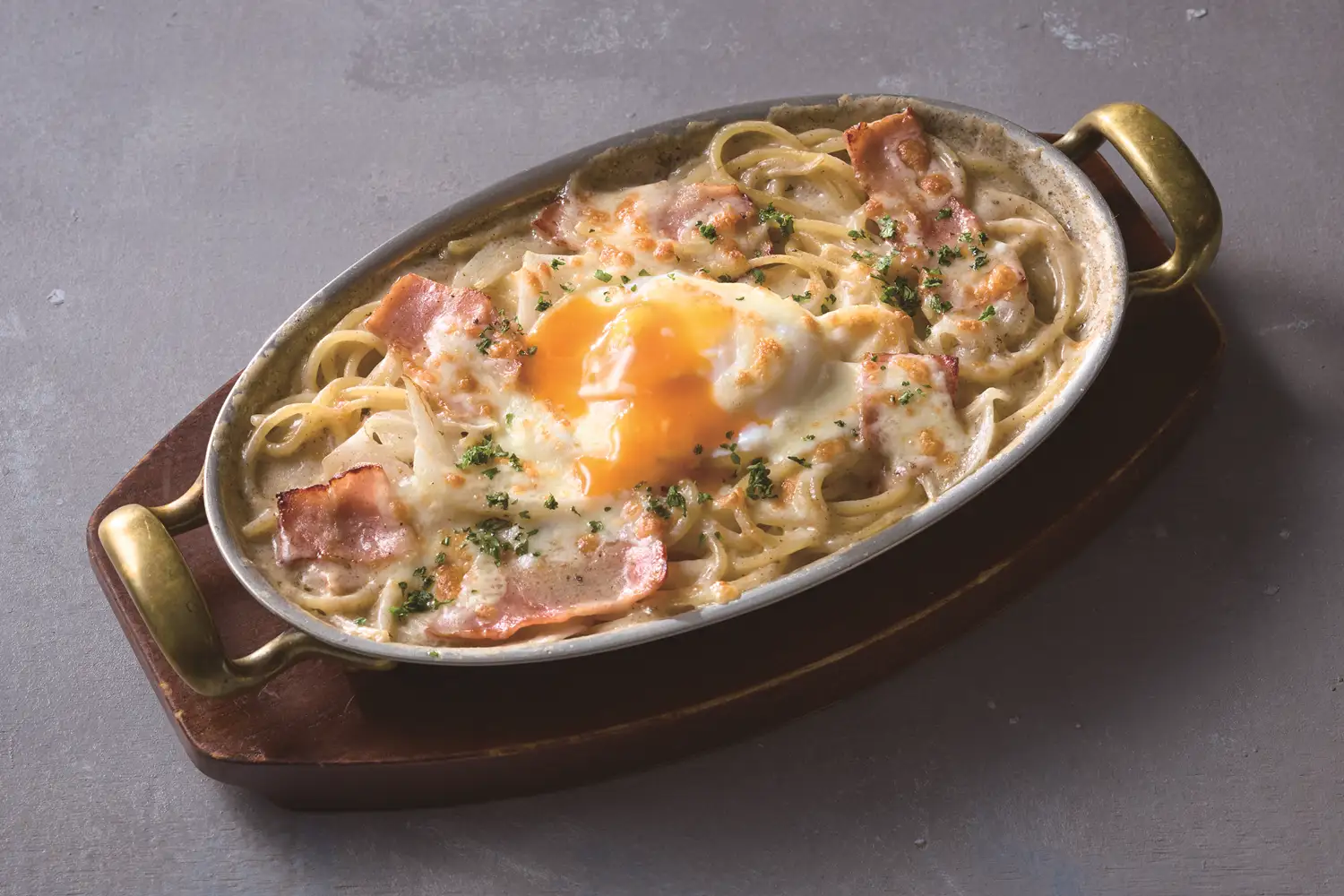 とろける半熟卵とベーコンの旨みに、芳醇なトリュフが香る濃厚クリームソースを合わせた、贅沢な一皿。ひと口ごとに、満足感のある味わいを楽しめます。