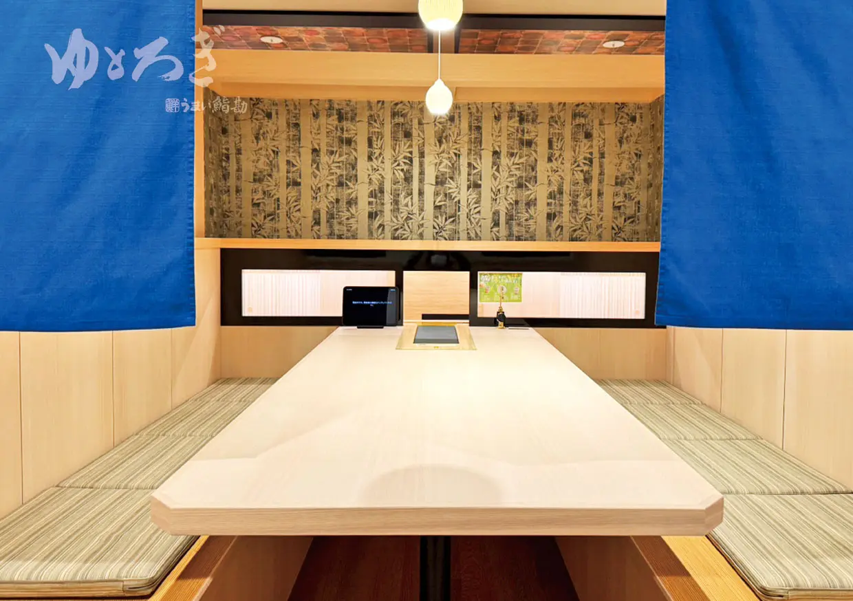 うまい鮨勘 ゆとろぎは、「ゆっくりくつろげる空間」をコンセプトにした、暖簾(のれん)で仕切られる半個室の新しい回転寿司。 レーンで運ばれてきた商品は、ベルトコンベアでテーブル中央に押し出される斬新な配膳システム。さらにタッチパネルオーダーで、お食事中の会話も途切れることがありません。