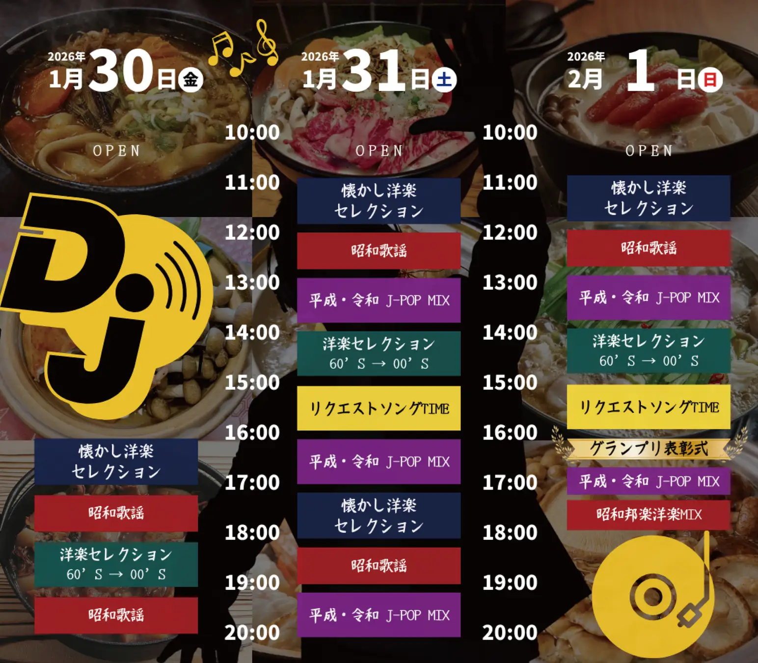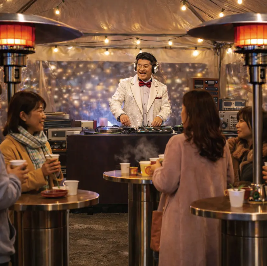 寒い季節に嬉しい!会場内に暖房の効いた”あったかテント”を設置。さらに、あったかテント内にDJが登場!目の前で懐かしい曲を流します。心ゆくまでお楽しみください。
