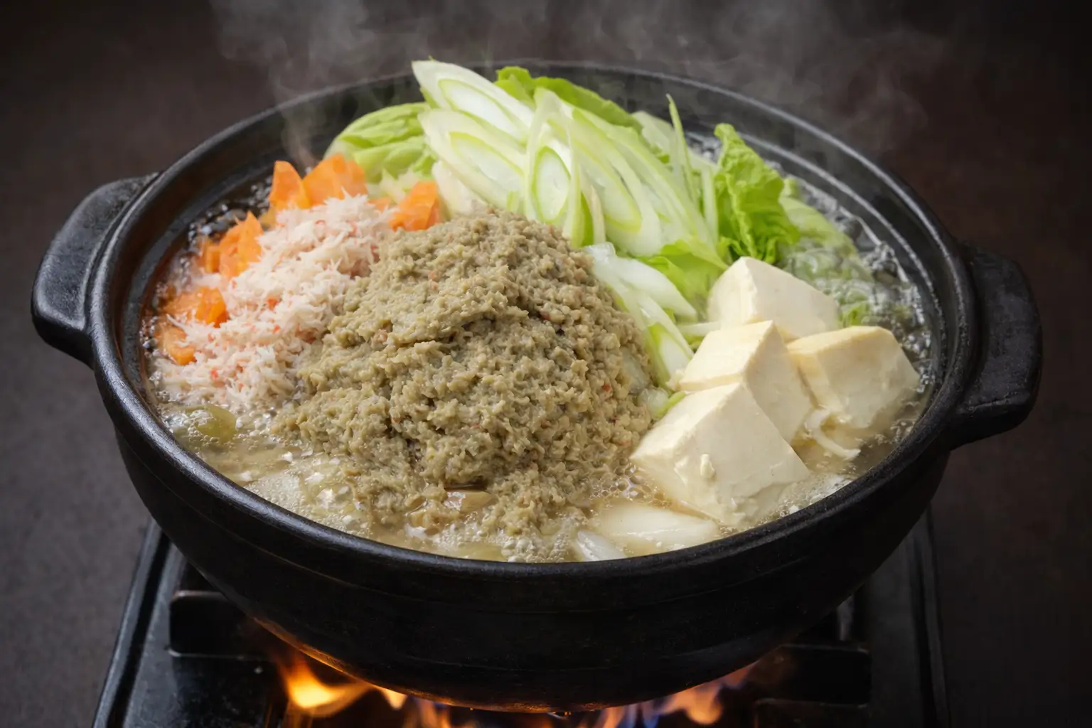 山形冬の陣全国鍋合戦第24代鍋将軍受賞。新潟産紅ズワイガニのカニみそを贅沢にカニ身と和え熱々の鍋にどーんとのせた一杯です。かにの旨み香り全部が入ったこの鍋を是非ご賞味ください。
