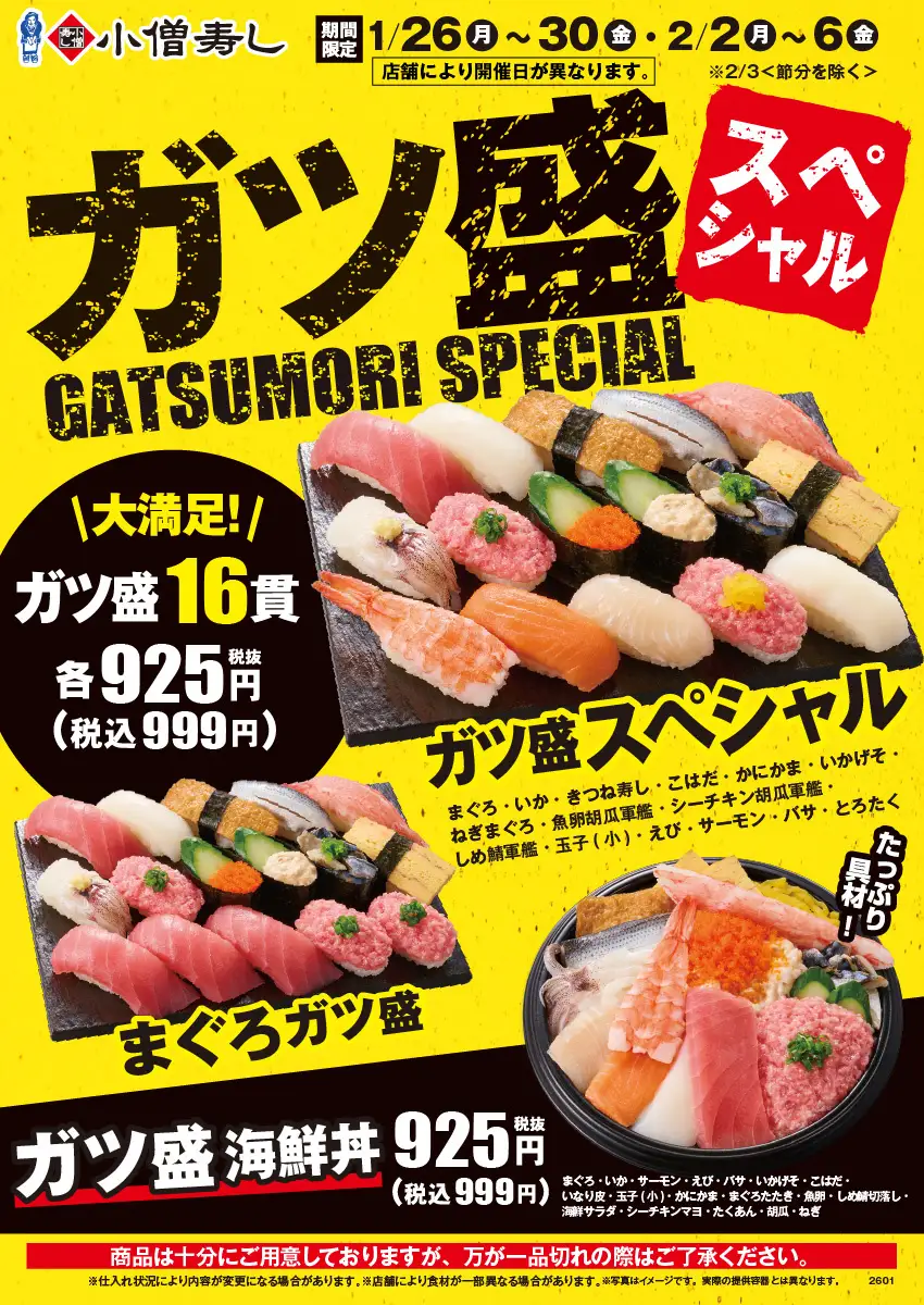 小僧寿しでは、ボリューム感と美味しさにこだわった『ガツ盛スペシャルフェア』を1月26日(月)~平日限定開催します!