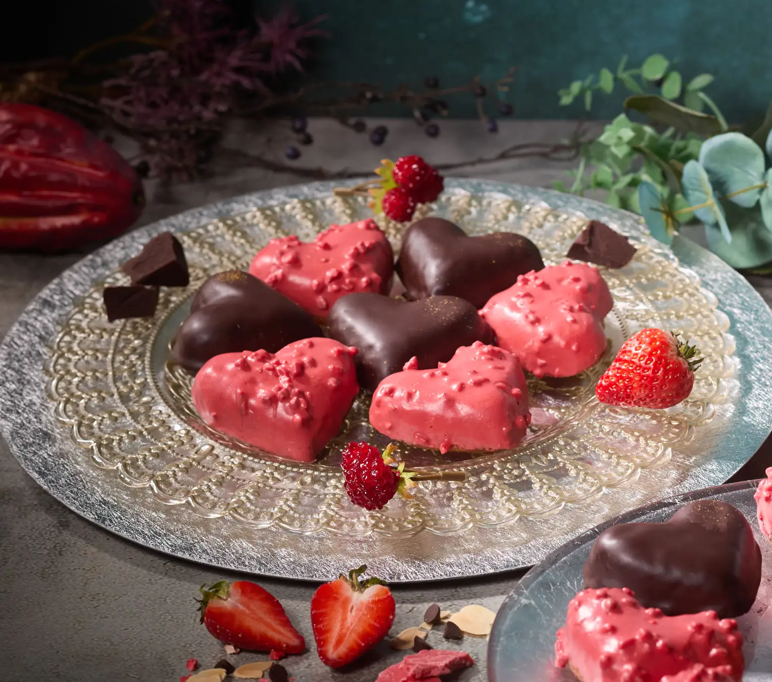 ココアフィナンシェ生地に生いちごコンフィチュールを重ね焼き上げ、シャリっと食感のチョコレートとカカオニブで仕上げました。