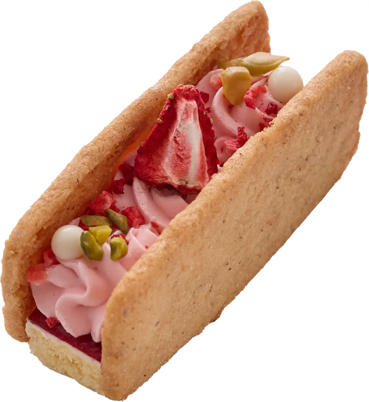 ジェノワーズ生地にバタークリーム、酸味と甘さが絶妙ないちごクーリー、苺のバタークリーム、大粒の苺フリーズドライを重ね、ヘーゼルナッツの芳醇な香りのしっとりサブレでサンドしました。
