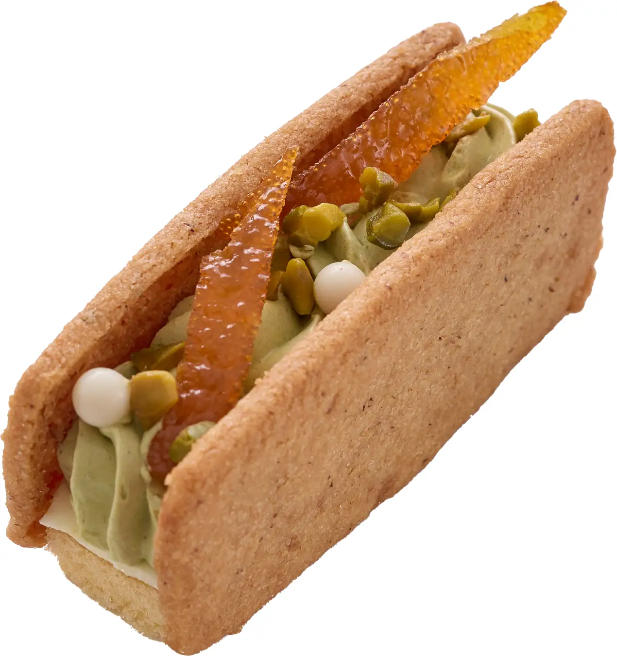 ジェノワーズ生地に爽やかなオレンジと、コクのあるピスタチオの2種類のバタークリームとオレンジの砂糖漬けを重ね、ヘーゼルナッツに芳醇な香りのしっとりサブレでサンドしました。