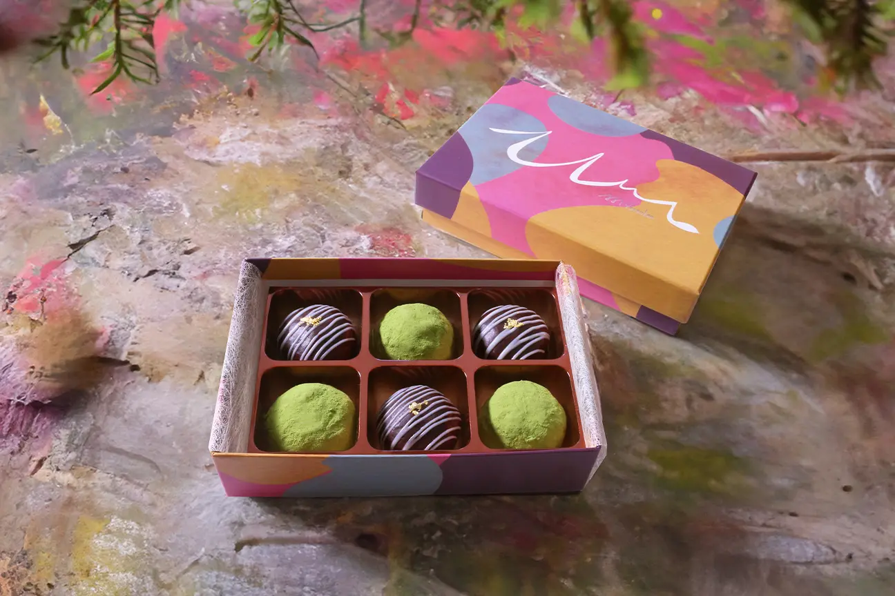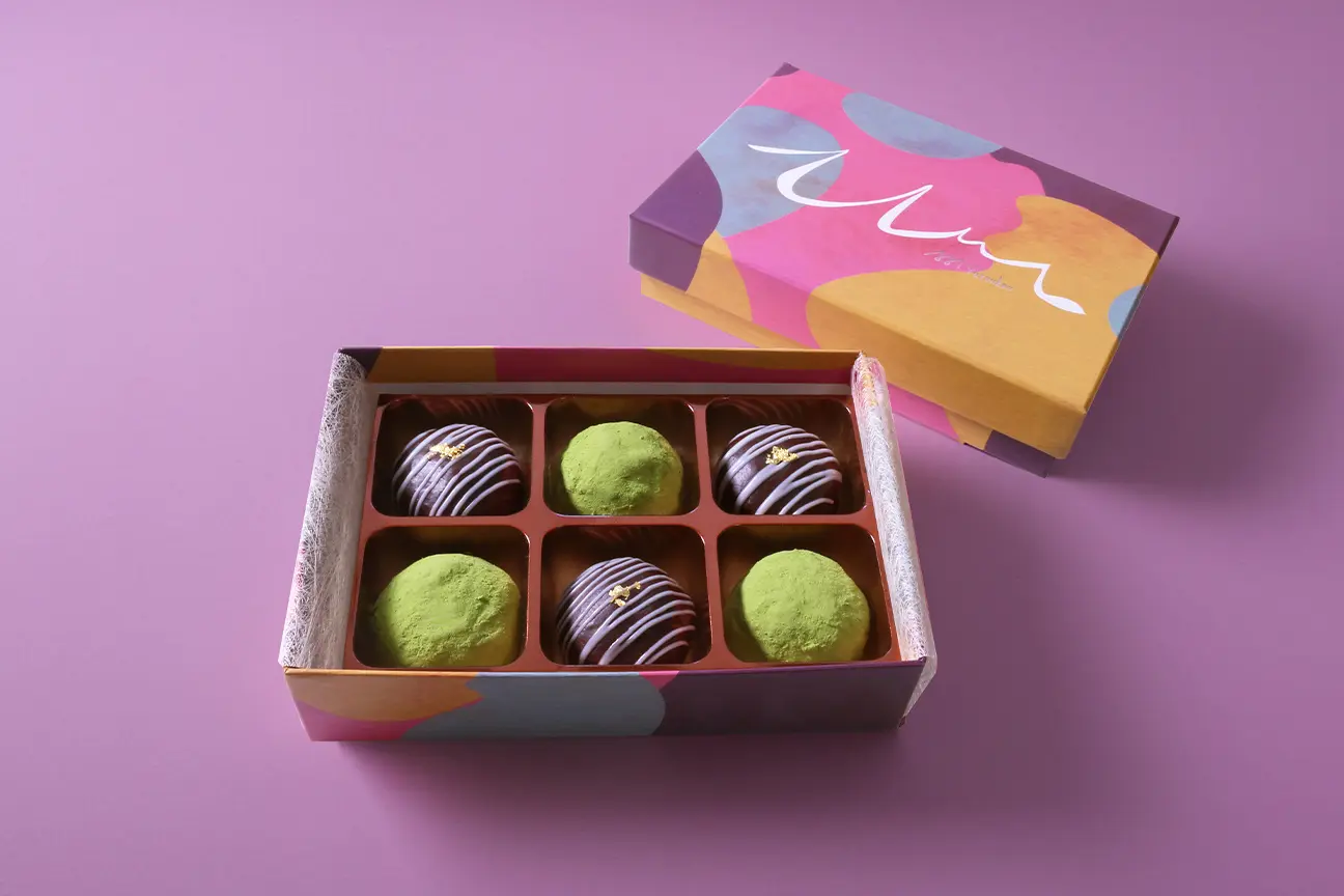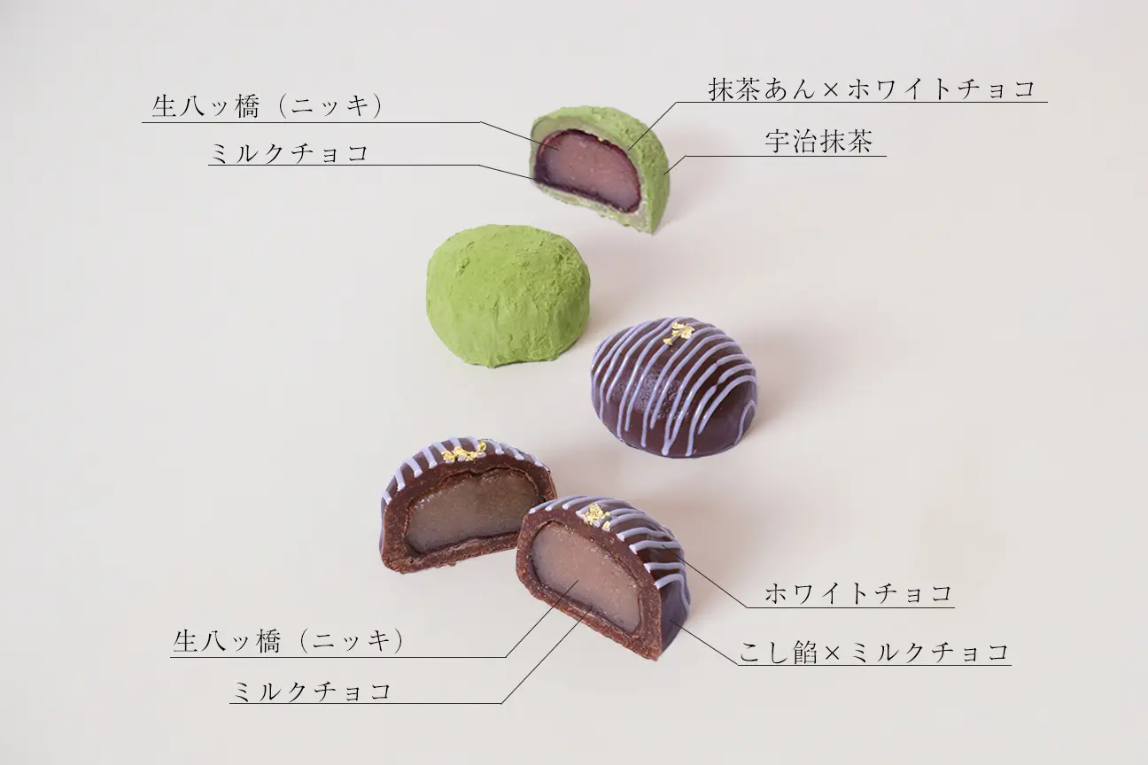 むにゅっとしょこらは、従来の生八ッ橋で餡を包むカタチから、発想の転換をし、チョコレートをたっぷり練り込んだチョコ餡でもちもちした生八ッ橋の生地を一つ一つ優しく包み込むことで、新食感のチョコレート菓子に仕上げました。コーヒーや紅茶とともに、ぜひお楽しみください。