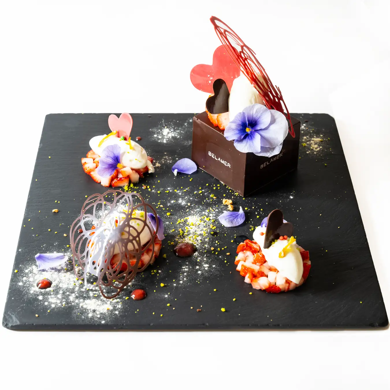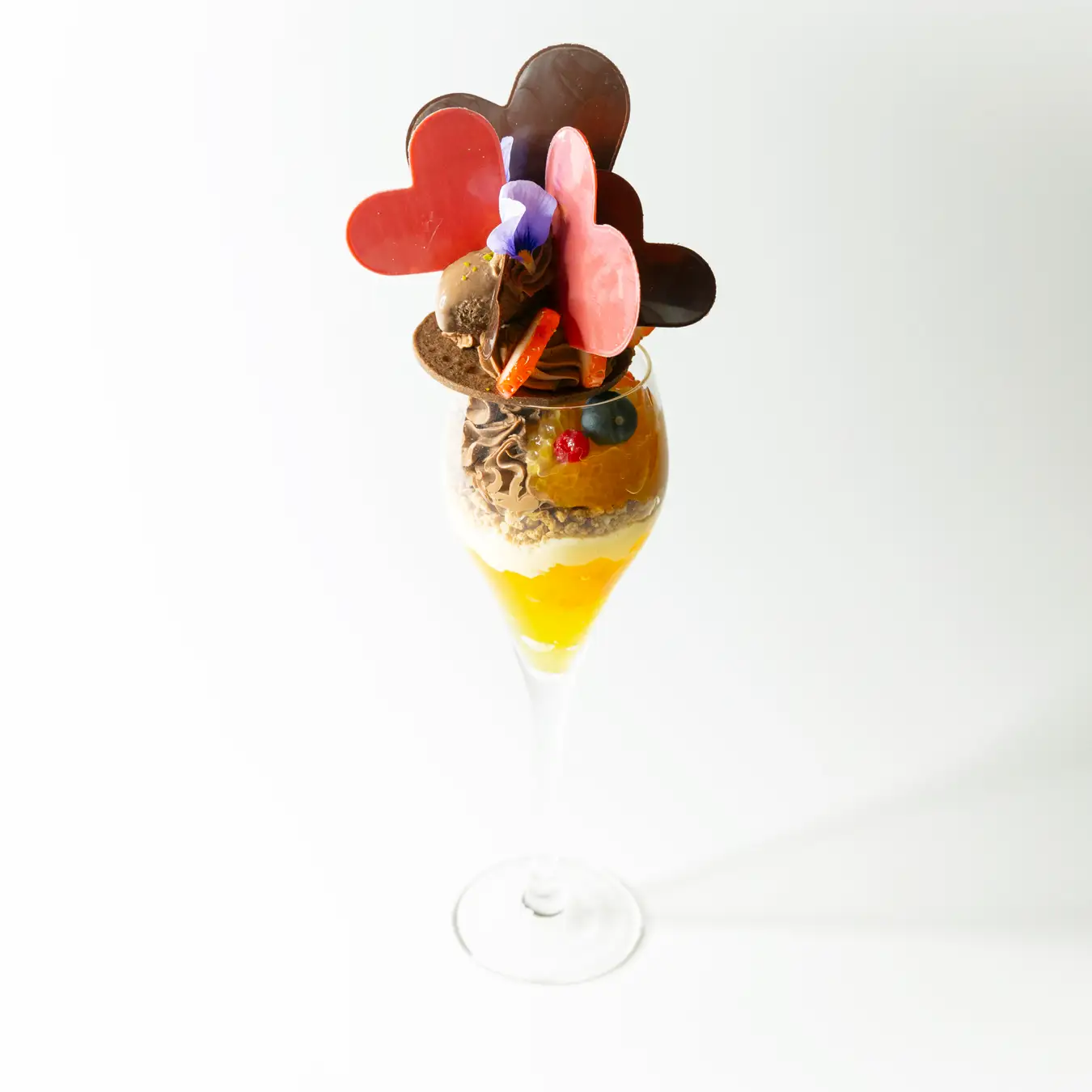 薄く仕立てたハート形のショコラを添え、