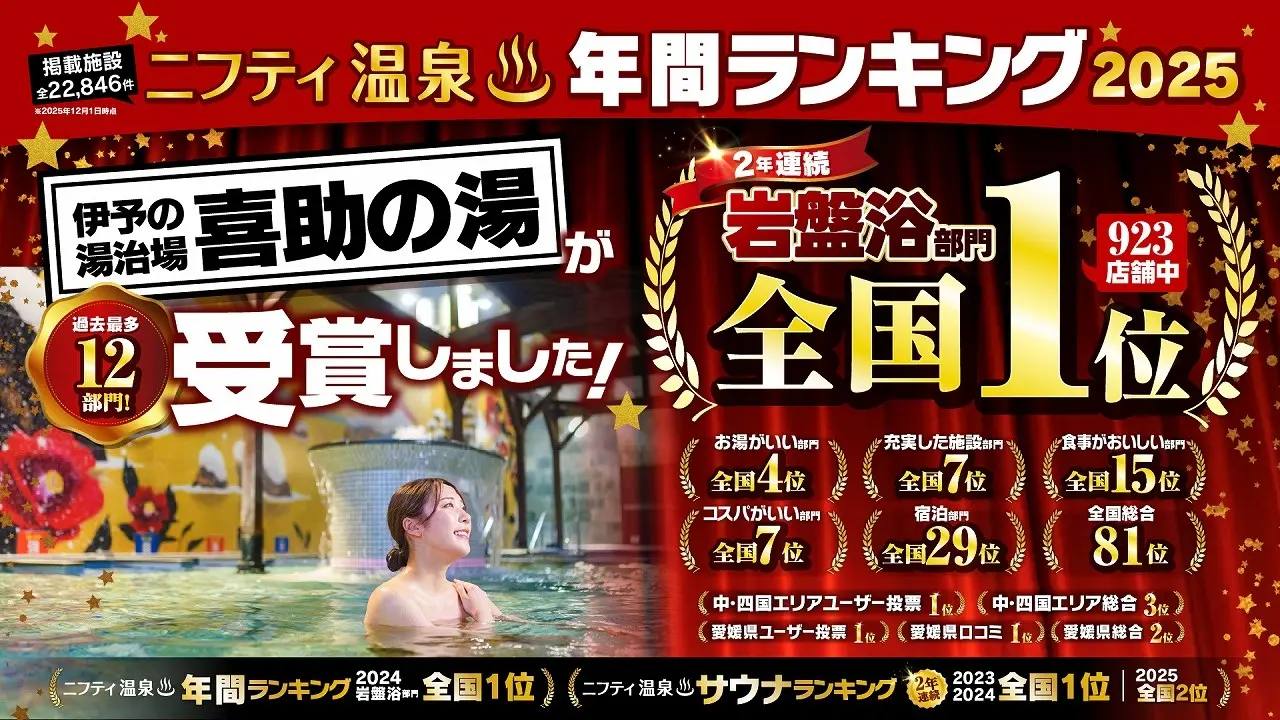伊予の湯治場 喜助の湯は、温泉情報サイト「ニフティ温泉」(運営:ニフティライフスタイル株式会社)が実施した「ユーザーが選んだ!食事がおいしい温泉・スーパー銭湯ランキング2025」において、全国約7,800施設の中から第9位に選出されています。