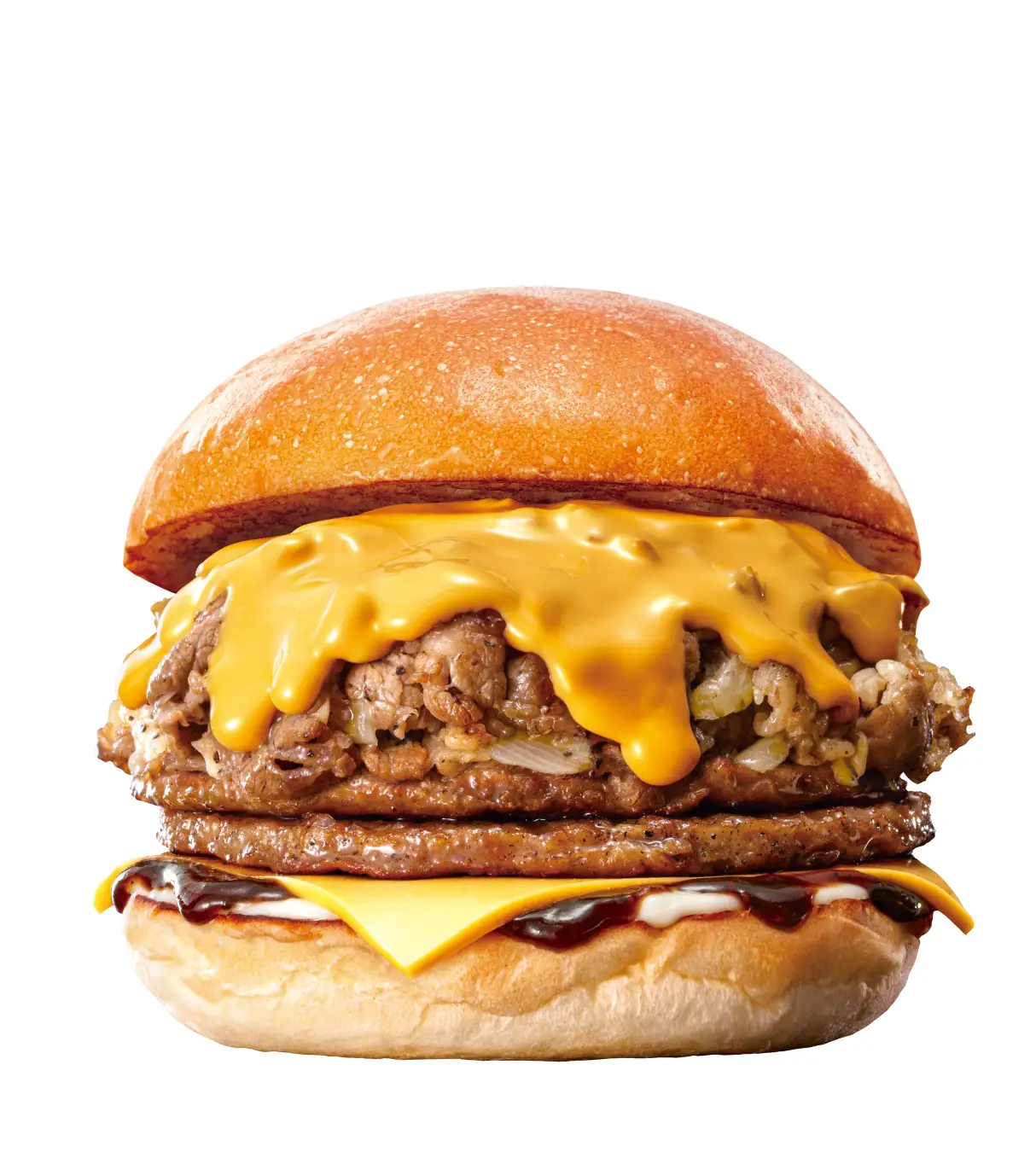 商品概要:ハンバーグパティに、ガーリックなどで下味をつけて鉄板で香ばしく焼き上げた牛カルビ肉や、オニオンを合わせ、とろ~り濃厚なレッドチェダーチーズソース、スパイシーでスモーキーな風味が特長のオリジナルBBQソースなどとともに、ふんわりもっちり食感のバンズで挟んだ商品です。