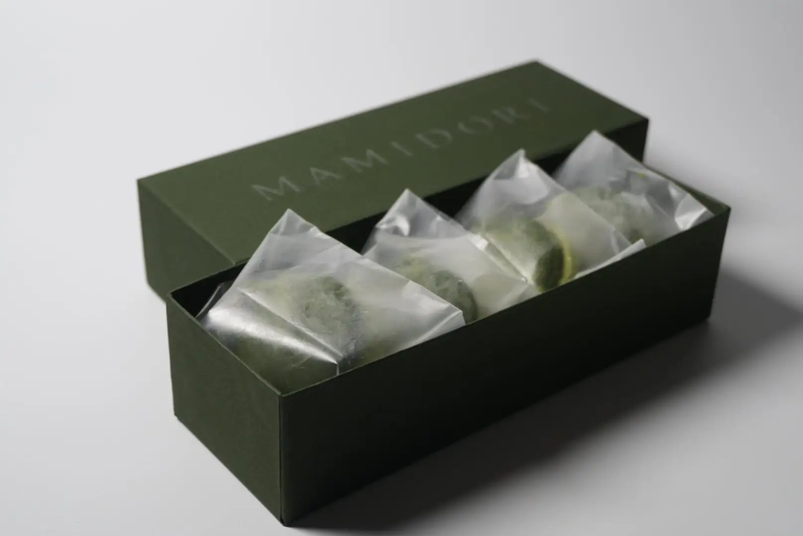 MAMIDORI大福:厳選した茶畑の高級な抹茶をふんだんに使用したMAMIDORIのメイン商品。まるでお茶をそのまま食べているような、濃厚な旨味が特徴の抹茶餡はぜひお試しあれ。