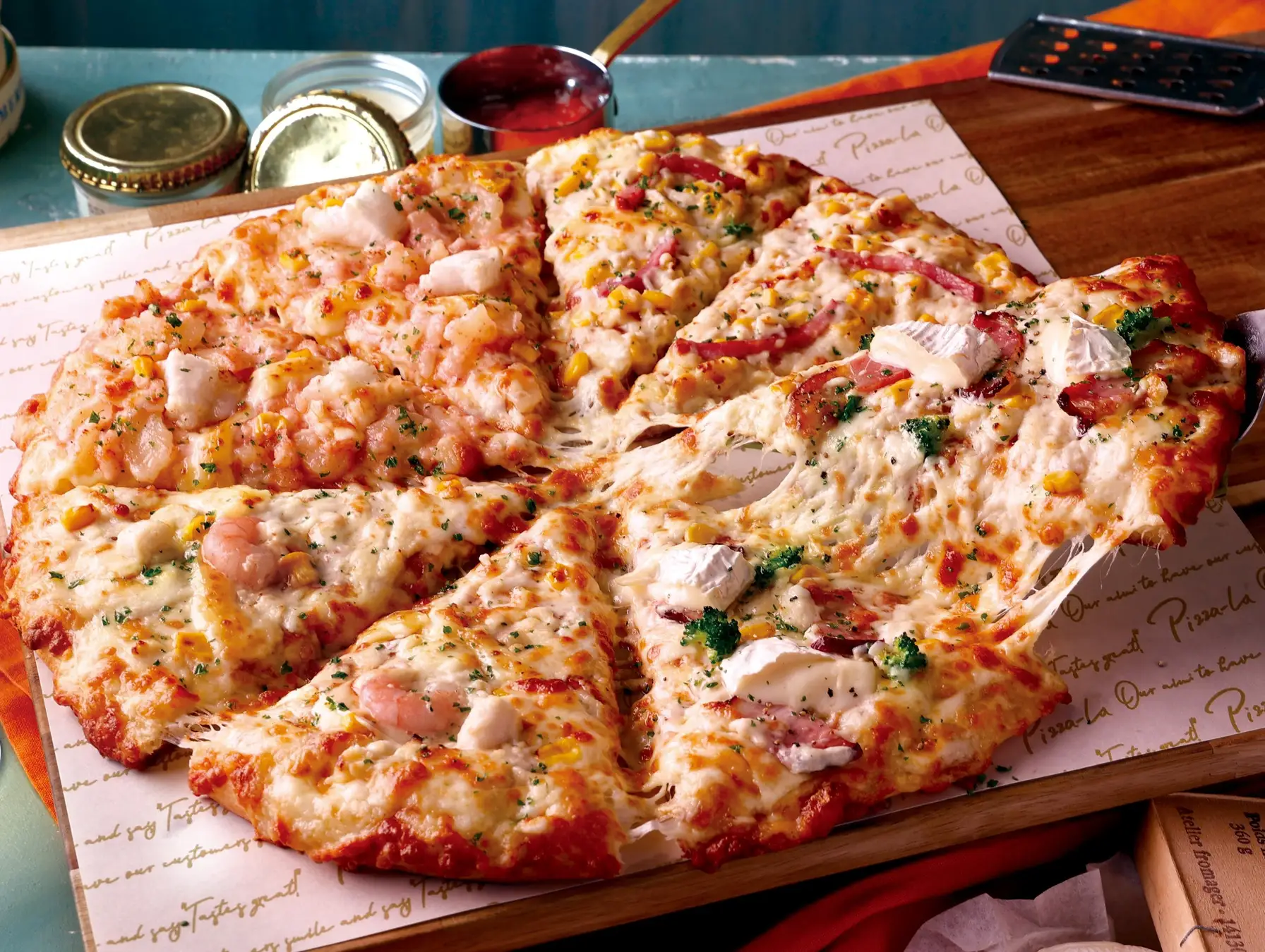 「熟成ベーコンと北海道カマンベールのクリーミーピザ」「濃厚クリーミーシーフード」「もち明太子ピザ」「たっぷりクリーミーコーンピザ」の、クリーミーな味わいを存分に楽しめる一枚。