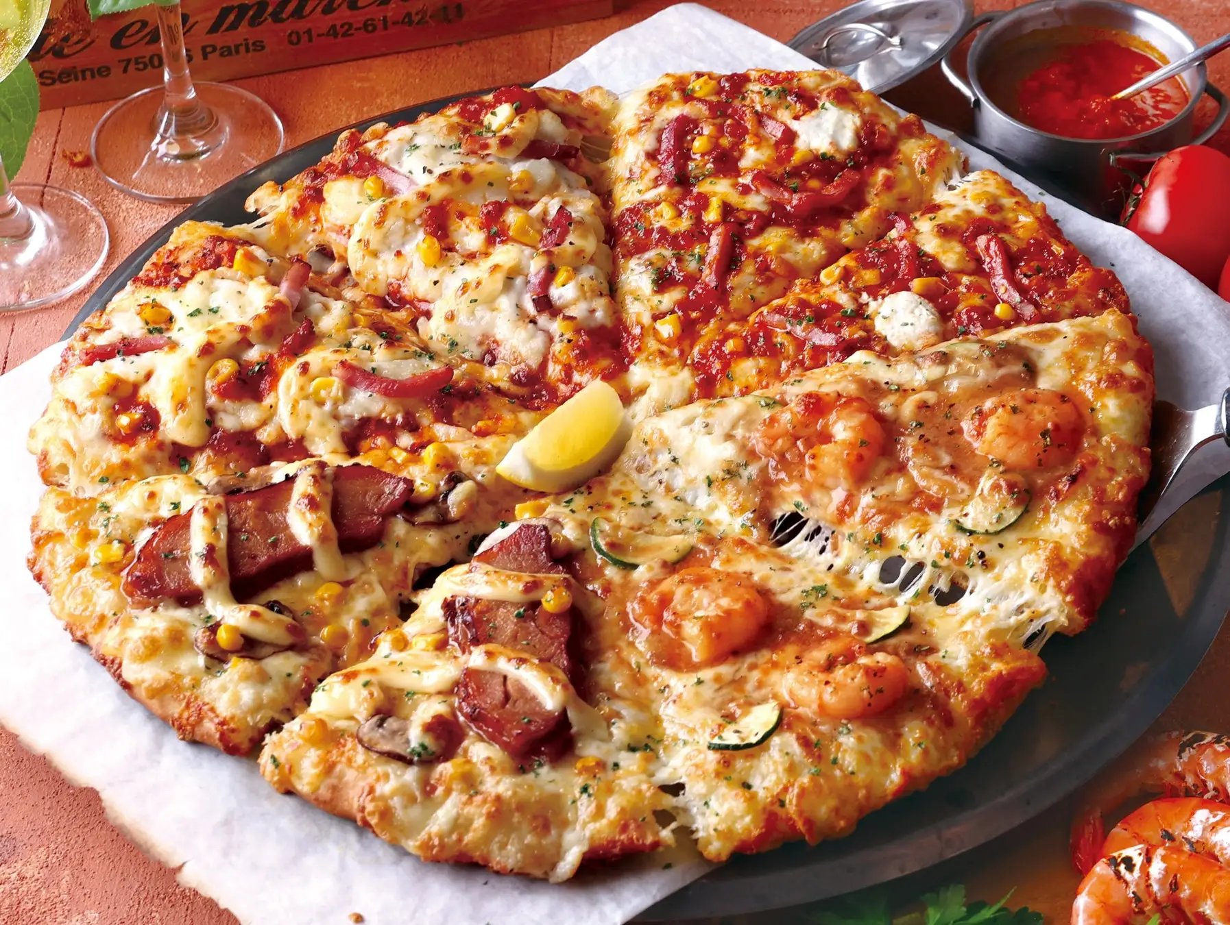 「大海老のガーリックシュリンプ」「テリヤキチキン」「ミート&マヨポテト」「濃厚ミートソース&厚切りベーコン」の4種類が1枚で楽しめるクォーターピザ。