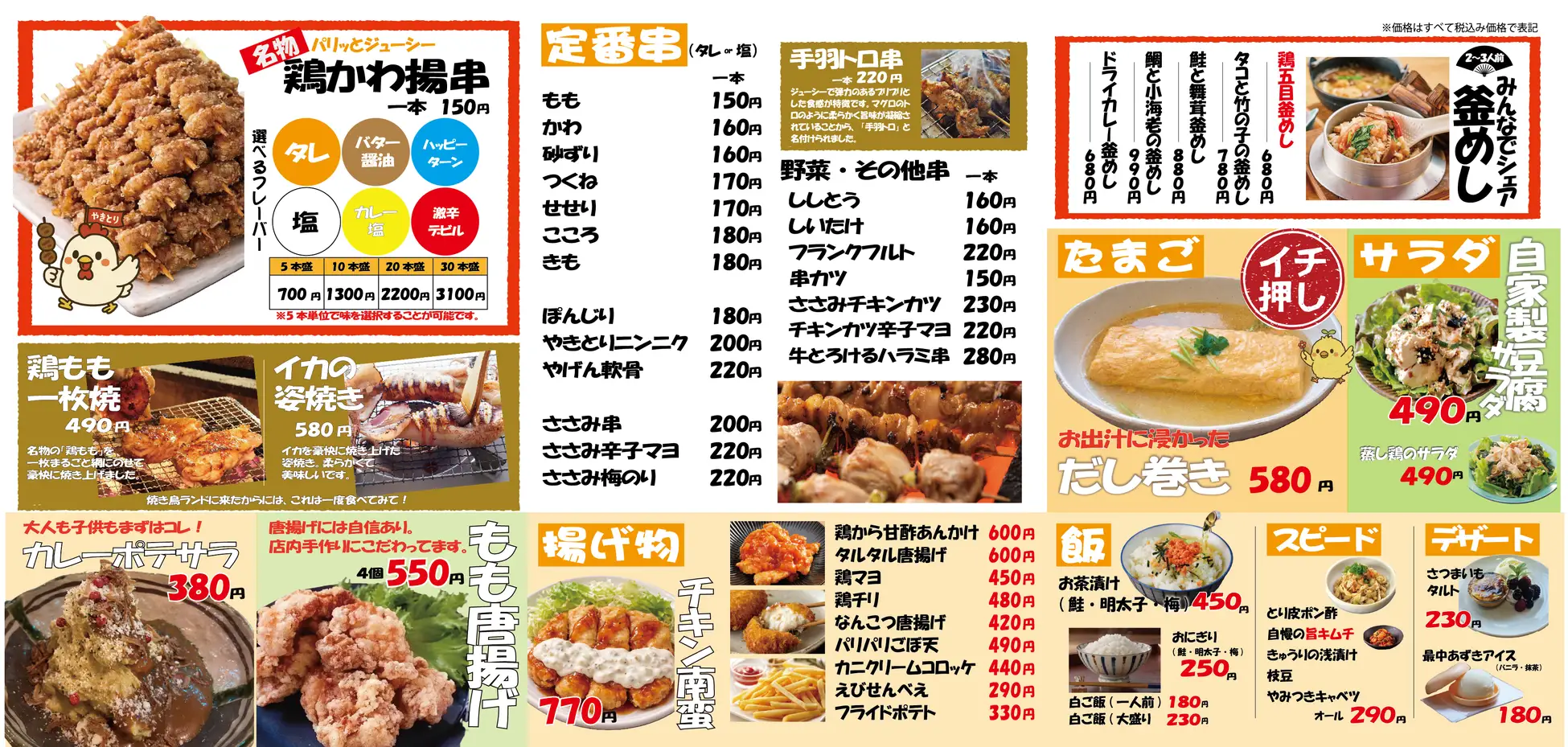 そこで、「焼き鳥ランド」は、どんな方でも気軽に本格的な焼き鳥を楽しんで頂けるように考えられた「ファミレス焼き鳥」を目指しています。ご家族で焼き鳥を楽しむ、友達同士で焼き鳥を楽しむ、仕事仲間と焼き鳥を楽しむ、恋人同士で焼き鳥を楽しむ、お酒があってもなくても「焼き鳥」を純粋に楽しんで頂けるお店、それが、「焼き鳥ランド」となります。